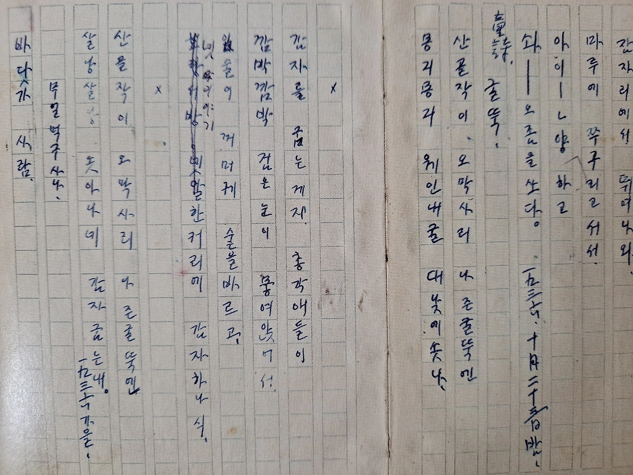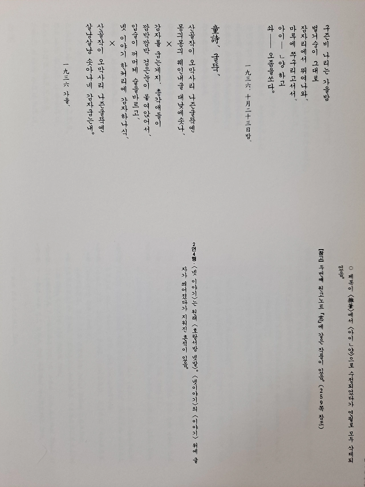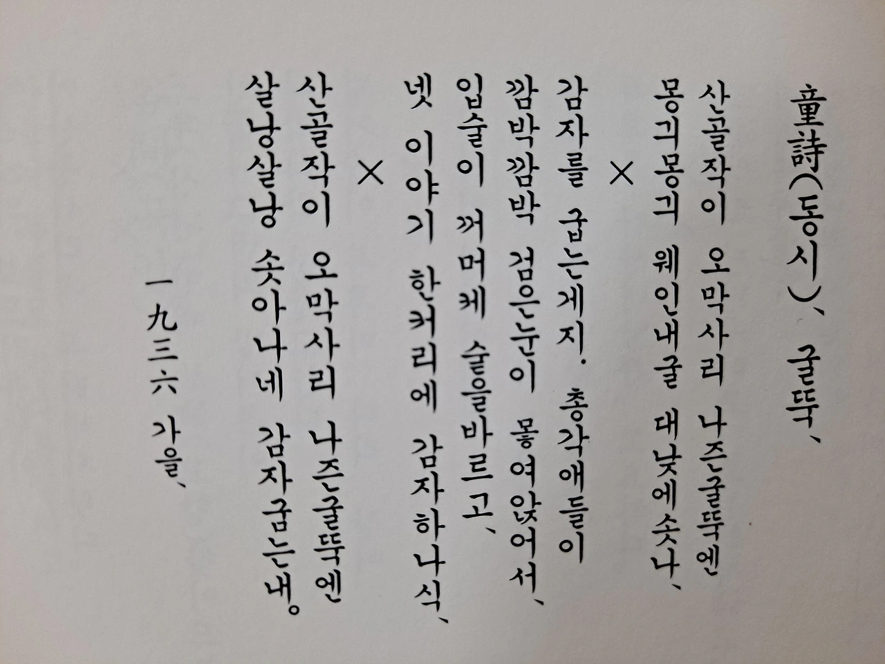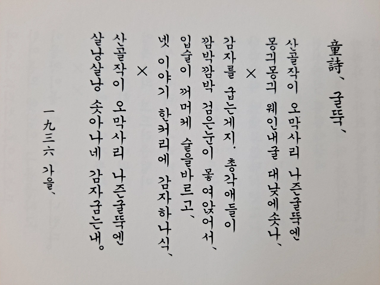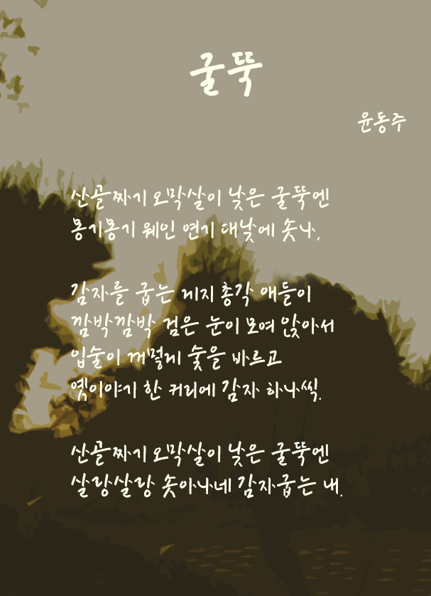 1936년 가을에 쓴 작품이다. 산골짜기에 있는 오두막집 굴뚝에서 피어오르는 연기와 감자 굽는 냄새에 대한 묘사가 인상적인 시로, 단출하고 가난한 살림살이에도 불구하고 가족들의 오순도순한 인정이 따스하게 다가오는 작품이다.