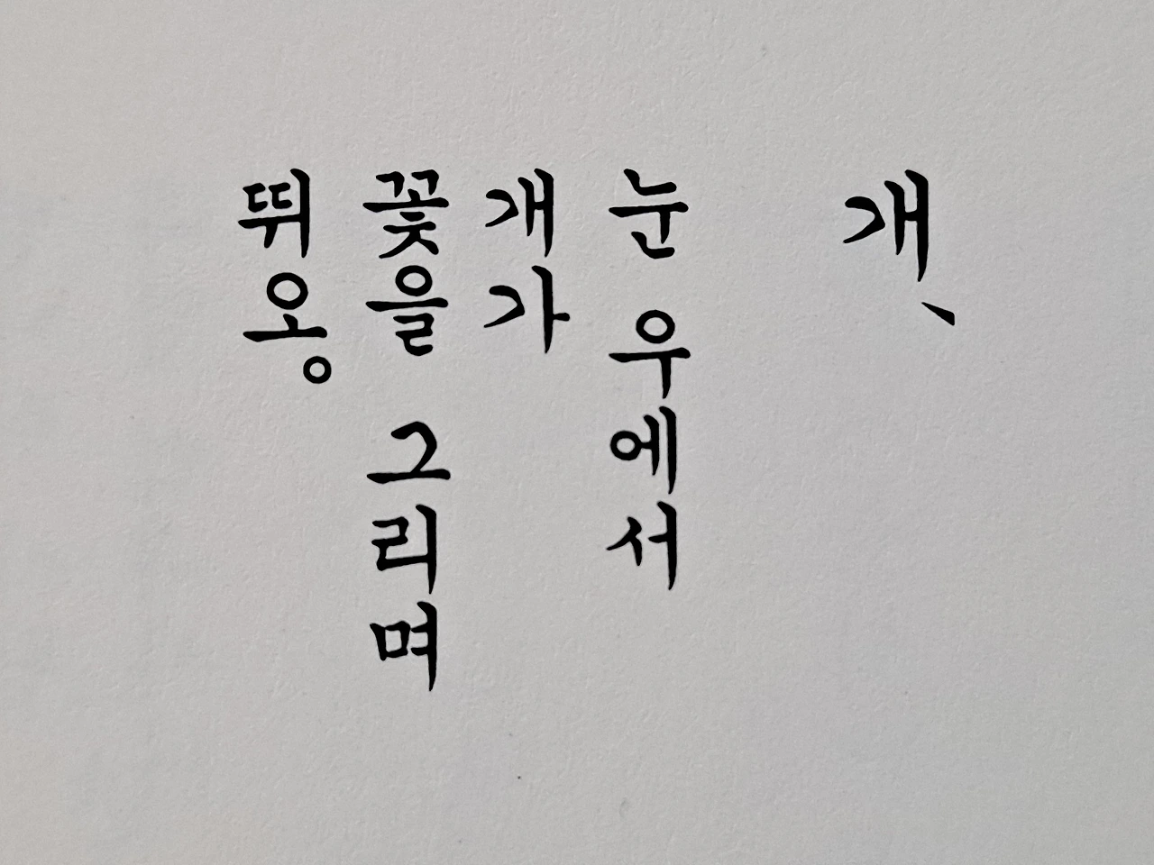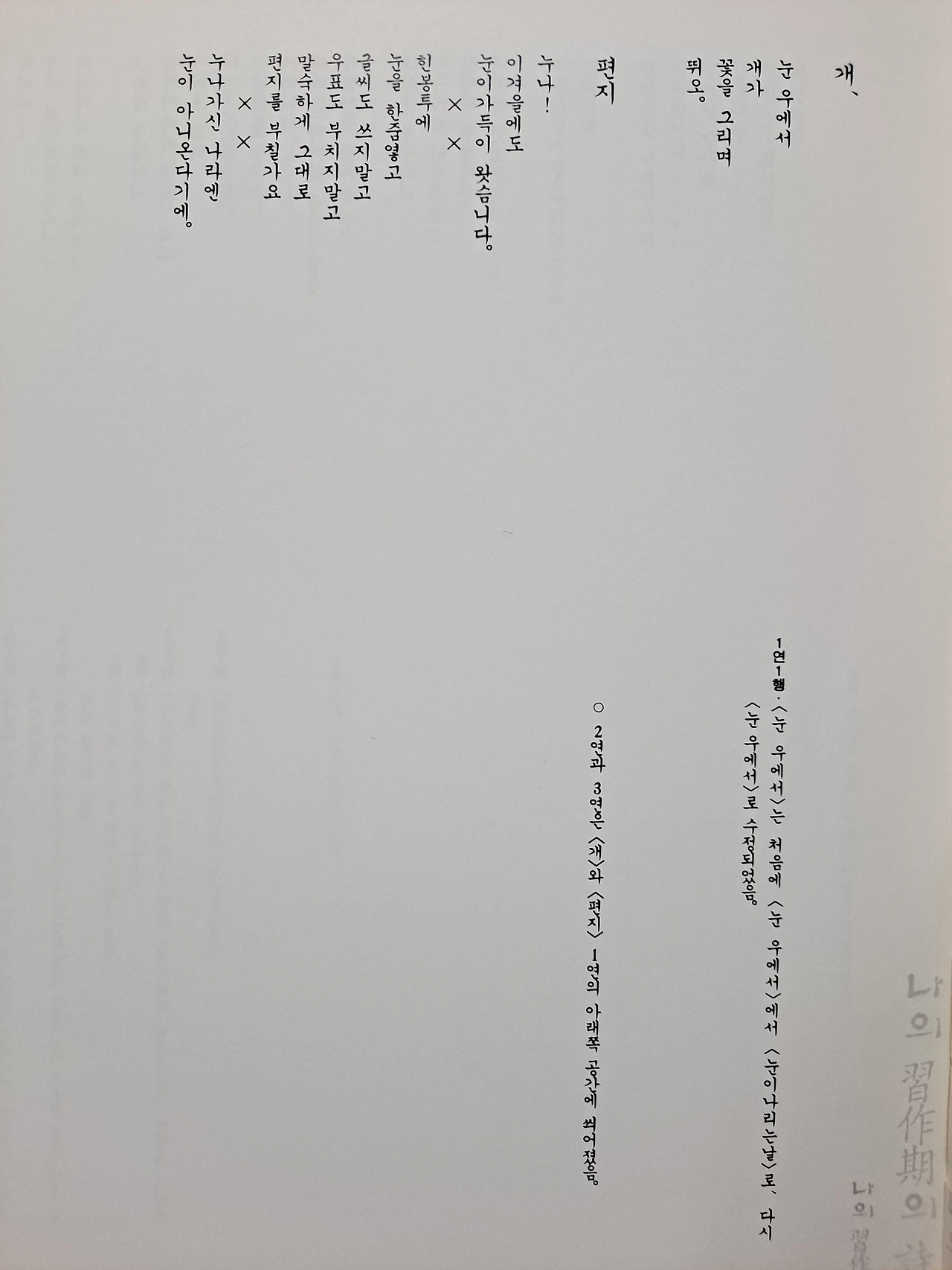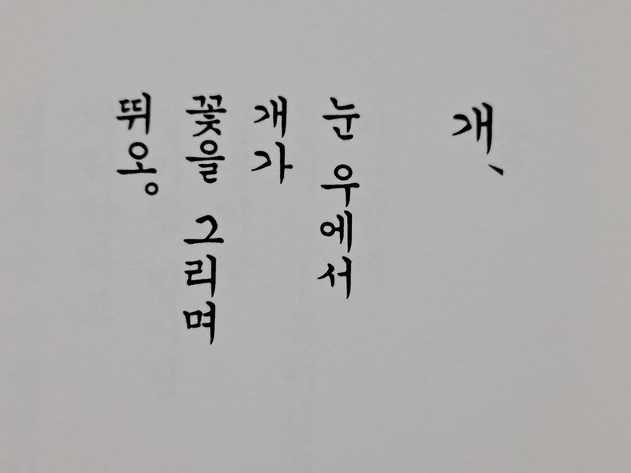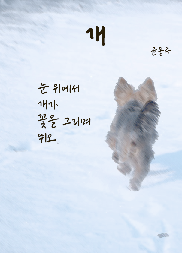 1936년에 쓰인 4행의 아주 짧은 동시다. 화자는 눈 위에서 개가 즐겁게 뛰는 모습을 말하고 있는데 개의 발자국을 꽃으로 표현한 것이 인상적이다.