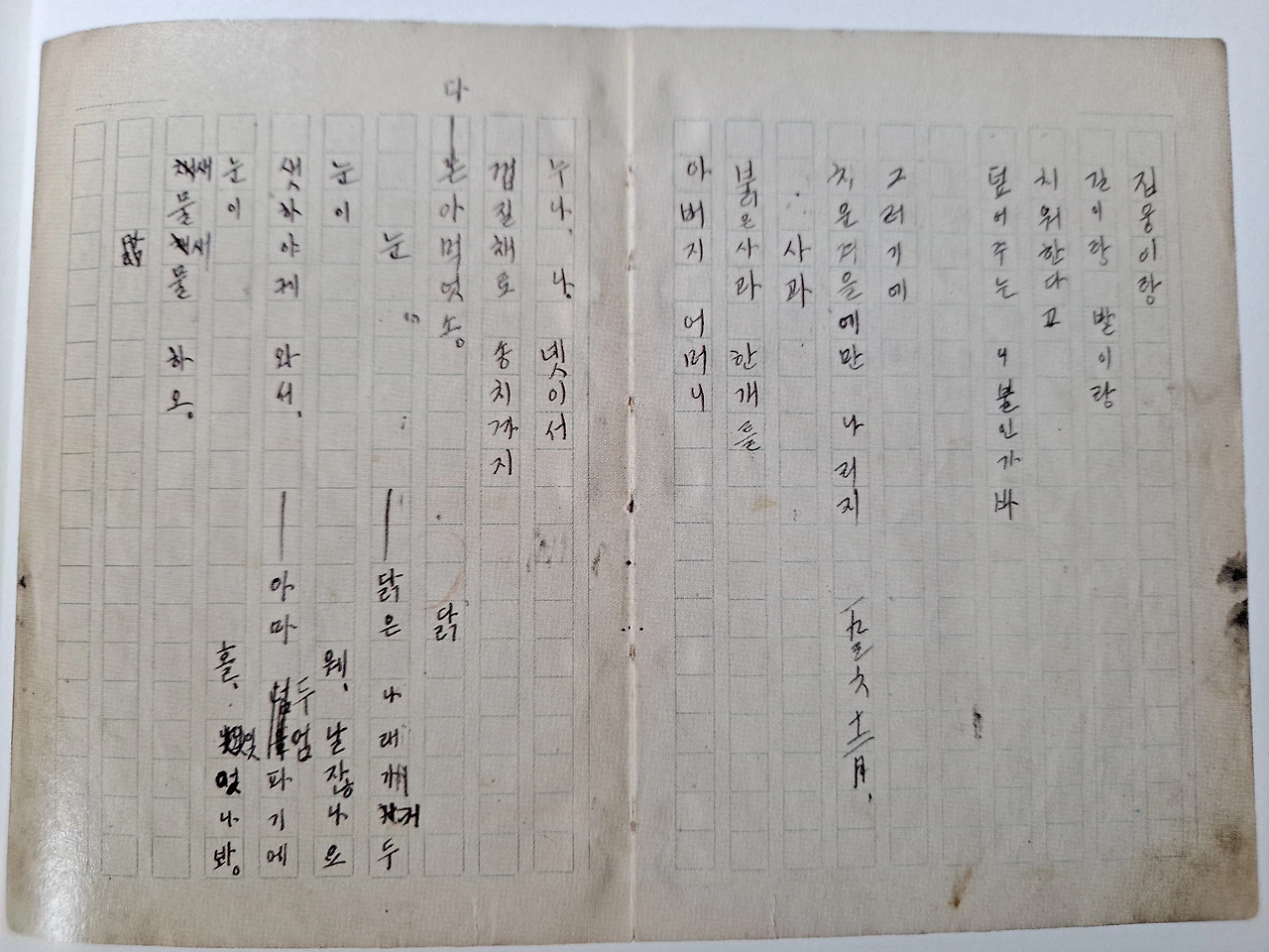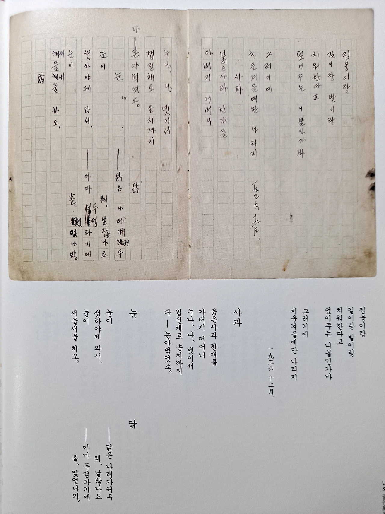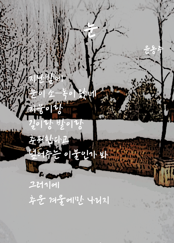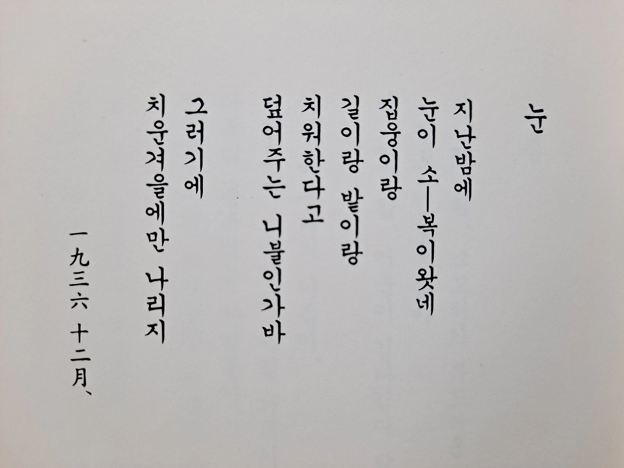 1936년 12월 동시로 추운 겨울에 내리는 눈을 이불로 묘사한 점이 인상적인 작품이다. 모든 사물이 추워 보이는 일제강점시 시절 따뜻한 이불처럼 보이는 눈을 보며 봄을 기다렸을 화자의 모습이 상상된다.