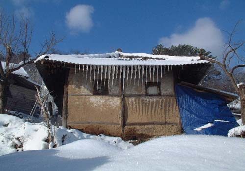 집에 가니 모두 꽁꽁 얼어붙었다. 화장실 좌변기 저장물통에 담긴 물도, 보일러실에 얼지 말라고 부동액을 넣어둔 물통도, 땅 속에 묻어둔 싱건지도, 지붕에서 눈 녹아 흐르는 홈통도, 하수구 내려가는 파이프 관도 모두 꽁꽁 얼어붙어 그야말로 얼음집이 되어버렸다.