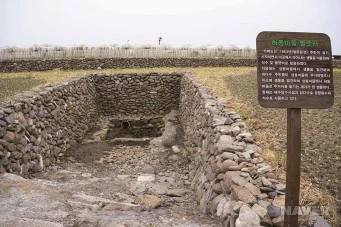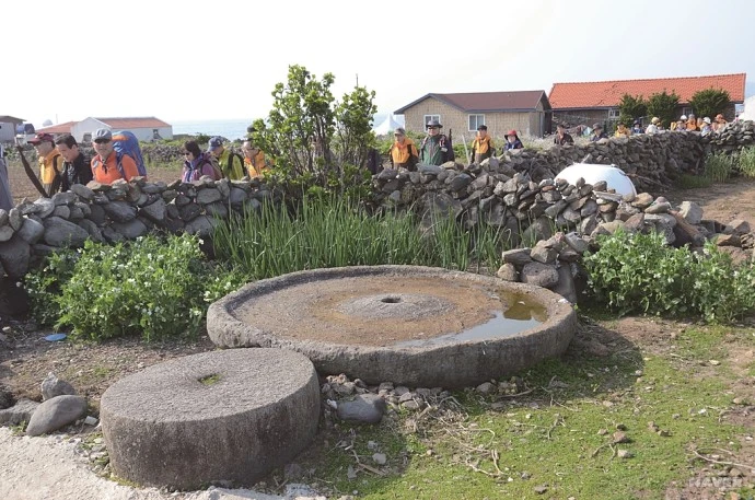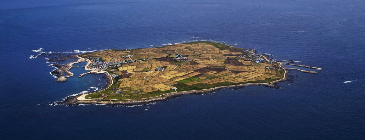 한국에 있는 섬 중에서 가장 낮게 자리한 섬, 탁자처럼 펼쳐진 평평한 대지를 걸어가 보니 가슴이 시원하다. 구멍을 크게 뚫어 쌓은 밭의 돌담들이 정겹다. 돌과 돌 사이의 구멍을 촘촘하게 쌓으면 양지바른 밭이 되지만, 반대로 태풍이 몰아쳐 오면 무너져버리기 때문에 자연과의 조화를 이루어야 농사를 잘 지을 수 있는 곳이다. 하느적거리는 억새풀들 위로 설치된 바람개비 풍력은 바람이 불지 않아 돌아가기를 잠시 멈추고 기다란 휴식을 취하고 있었다.