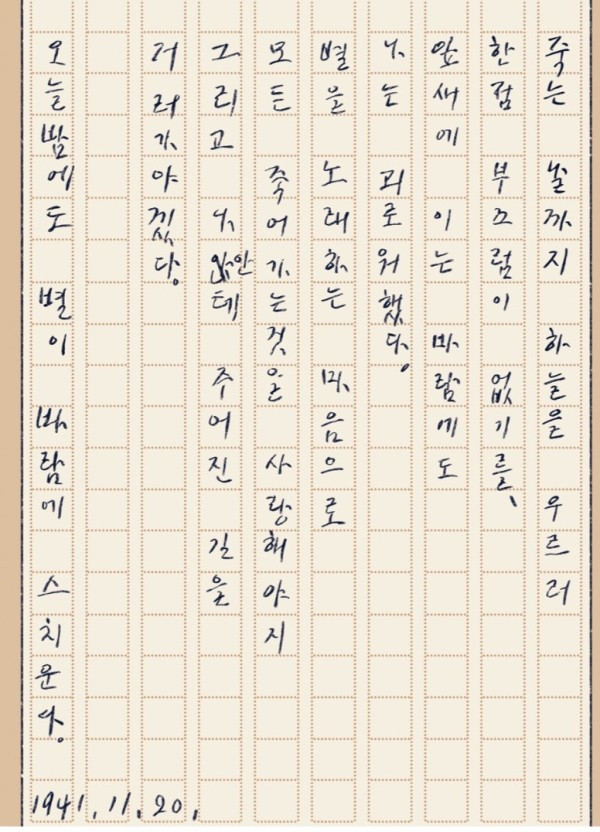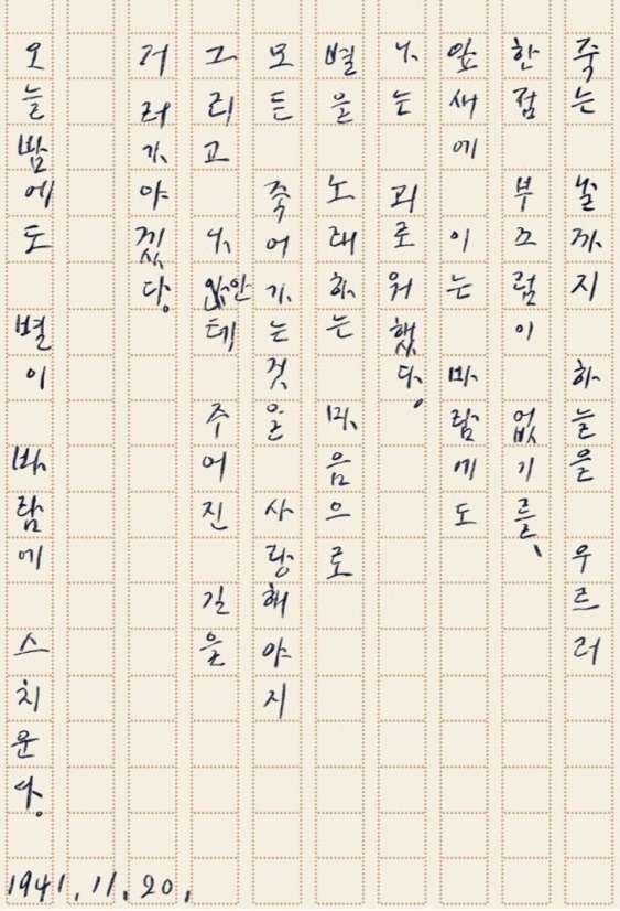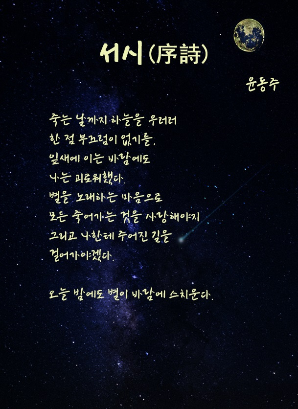 우리나라 사람이라면 어느 누구라도 좋아하는 윤동주 시인의 <서시>. 일본에게 나라를 빼앗겨서, 온 겨레가 절망과 슬픔으로 가득했을 때(1941년 11월 20일)에 쓴 시. 그때 윤동주 시인의 나이는 25세. 그러니까 이 시가 태어난 지가 벌써 80여 년이 지났다. 그런데도 오늘날까지 이 시를 가슴에 묻고 살아가는 사람들이 많은 이유는 무엇일까.