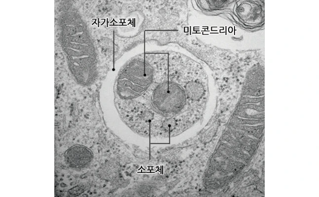 일본 도쿄대 의대 세포생리학과 노보루 미즈시마 교수팀이 전자현미경으로 촬영한 오토파지. 쥐 배아의 섬유모세포에서 찾았다. 자가소포체 안에 노화한 소포체와 미토콘드리아가 보인다. <출처: Noboru Mizushima, et al, Nature Cell Biology, 12, 823–830>