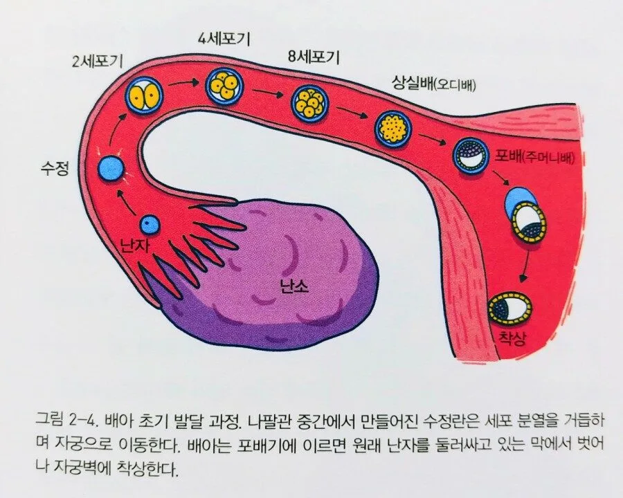 난자는 수정되면 발생을 시작하여 자궁에 착상하고 발육을 계속한다. 수정 후 3주째가 되면 내배엽, 중배엽, 외배엽의 3개 세포층이 생기고, 이 중 내배엽에서는 장이나 위 등 소화기와 소화샘, 허파 등의 상피가 생기며, 중배엽에서는 근육, 골격, 순환기, 배설기, 생식기 등이, 외배엽에서는 신경계, 감각기, 피부, 털, 손톱 등이 생긴다. 수정란이 발생하여 어린아이로 되는 데에는 평균 41회(241=2.2 ×1012)의 체세포 분열이 일어난다. 자라면서 이보다 더 많이 분열해 어른의 경우 약 60조 개의 세포를 갖는 개체가 된다. 우리 몸은 약 60~100조 개의 세포로 이루어져 있다고 한다.