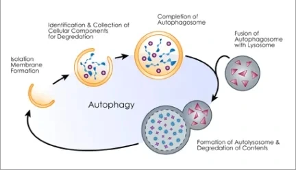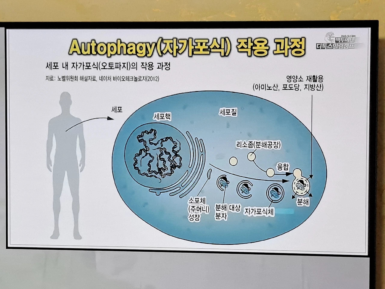 오토파지는 자신의 낡고 약해진 몸 일부를 잡아먹는 것입니다. ‘오토’는 자신, ‘파지’는 먹는다는 말로 자식작용이라고도 합니다. 낡은 조직이나 세포 또는 세포 내 구조물을 탐식세포나 파고좀이 먹고 분해하는 것을 말합니다. 주로 포도당과 같은 에너지원이 부족할 때 즉 배가 고플 때 오토파지가 활발해집니다.