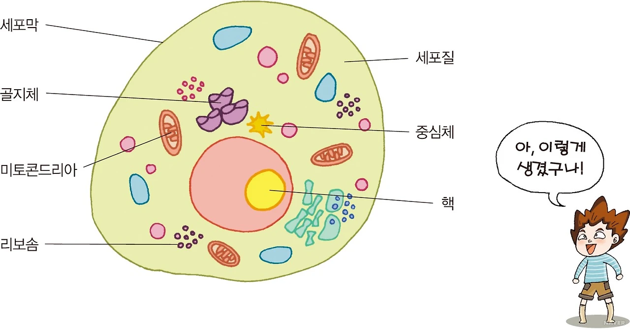 먼저, 둥근 모양의 핵이 있어요. 핵 속에는, 세포를 유지하고 새로 만드는데 필요한 모든 정보가 다 들어 있어요. 세포에 힘을 주는 에너지 창고는 미토콘드리아지요. 우리 몸에 꼭 필요한 단백질을 만들어 주는 리보솜, 세포 내 단백질과 지방을 적절히 나누고 보내 주는 골지체도 있어요.