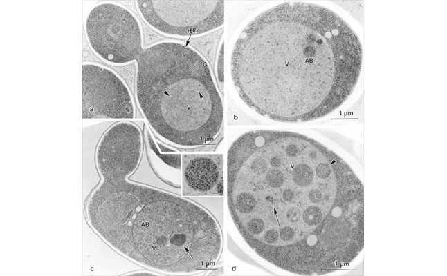 오스미 교수의 효모 실험 결과. G는 골지체, V는 액포, AB는 자가소포체다. 그림 b와 d를 비교하면 자가소포체의 변화를 알 수 있다. <출처: Journal of Cell Biology, 1992, 119, 301-311>