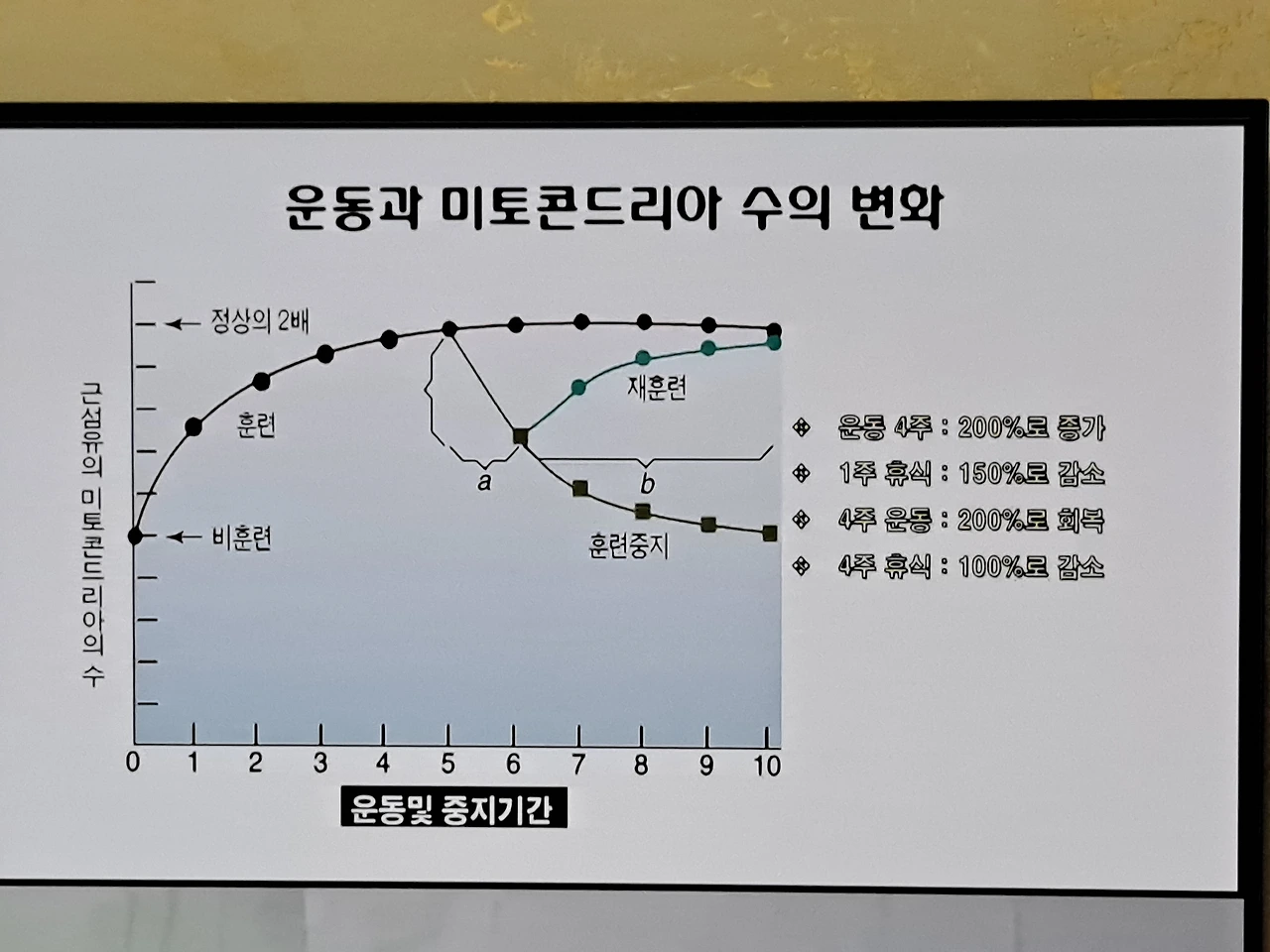 에너지 수요에 대한 반복적인 자극이 높은 단련자의 근육세포에는 미토콘드리아가 비단련자보다 1.5~2배 정도 많으며, 미토콘드리아 개개의 크기도 크다고 알려져 있다.