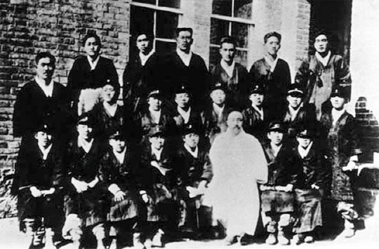 명동소학교 졸업사진. 두 번째 줄 오른쪽에서 첫 번째가 윤동주다.