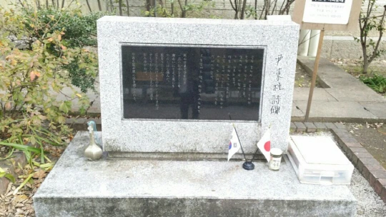 일본 도시샤대에 있는 윤동주 시비. 일본인들이 태극기와 일장기를 함께 갖다 놓은 게 눈에 띈다. 손정순 시인 제공
