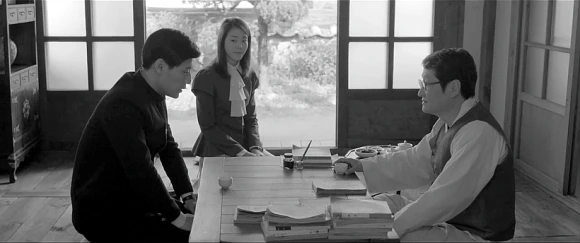 영화 ‘동주’에서 윤동주(왼쪽)와 정지용(오른쪽)이 만나는 장면. 그러나 둘이 생전에 만났다는 문헌적 증거는 없다. 다만 정지용과 윤동주는 일본 도시샤대 영문과 선후배였으며 해방 후에 정지용은 윤동주의 동기인 강처중을 통해 윤동주의 유고를 접했고, 시집 초판에 서문을 썼다.