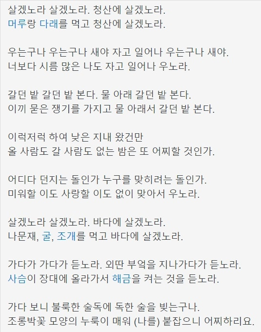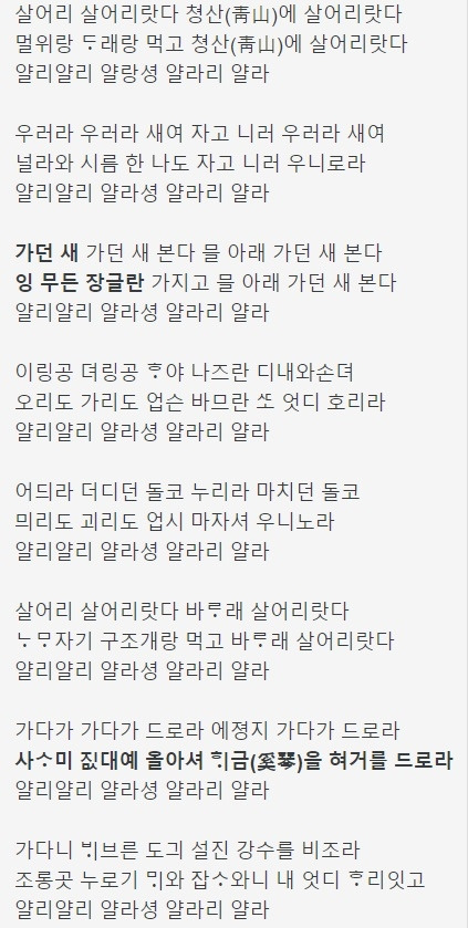 이링공 뎌링공 하야 청산에에~ 살어리랏다