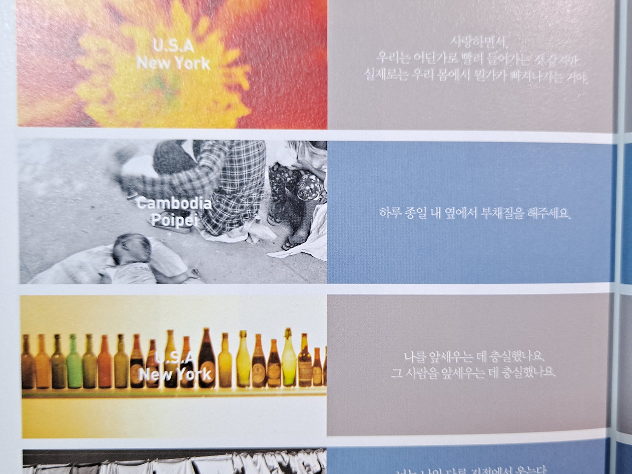 Q. 역시 시인님에게 사진 얘기를 빼놓을 수 없을 것 같네요. 사진과 글, 어떤 장면과 감정의 순간 그리고 이야기를 기록한다는 점에서 비슷한 기능을 하지만 각각의 매력은 다른 것 같습니다. 사진과 문장에 대한 시인님의 생각을 듣고 싶습니다.