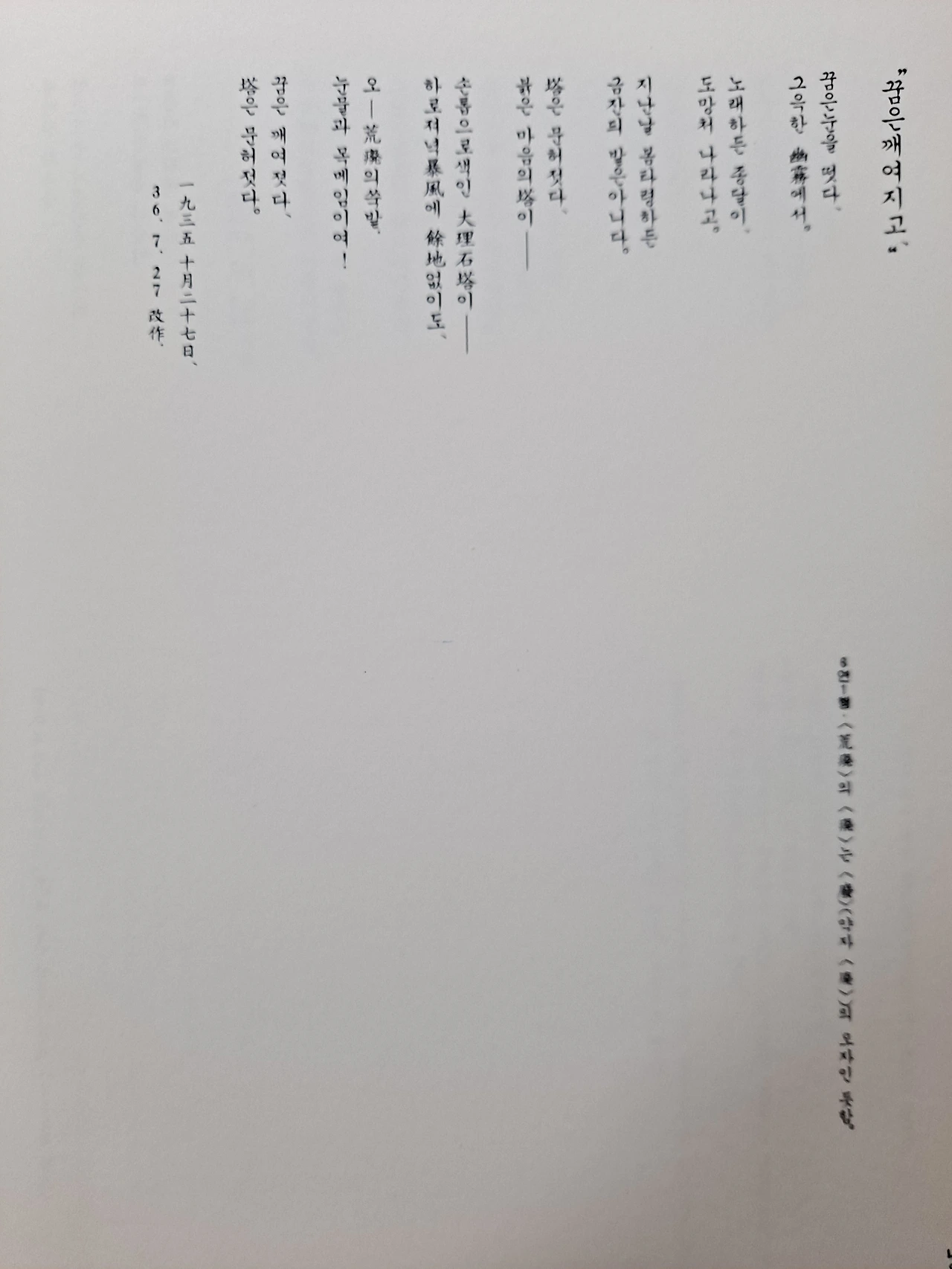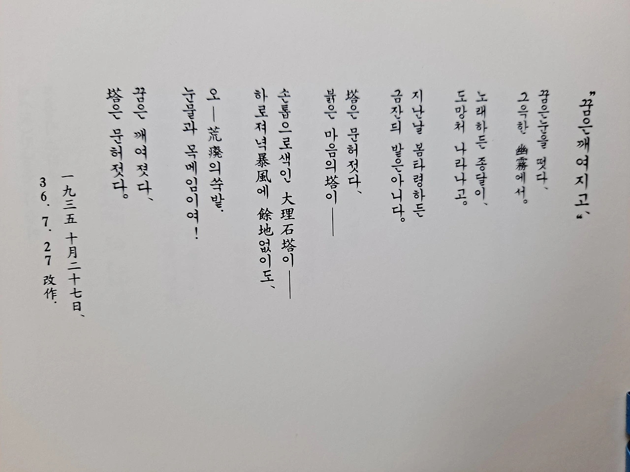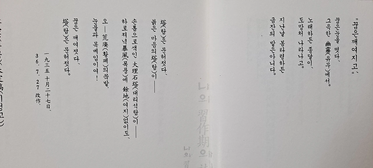 1935년 10월 27일에 탈고한 것으로 되어있다. 그래서, 『나의 습작기(習作期)의 시(詩) 아닌 시(詩)』 에는 개작한 날을 기준으로 해서 상당히 뒷부분에 실려 있는데 나는 탈고한 날을 기준으로 해서 앞부분에 싣고 먼저 다루기로 한다. 앞에 소개한 <공상>의 연장선에 있는 듯하다. <공상>에 등장하는 탑 이야기가 여기서 이어지기 때문에 <공상> 다음에 이어서 하는 것이 더 좋겠다는 생각이 들어서 순서를 바꾼 것이다. 1936년 7월 27일 작품으로 되어 있으나 앞에서 언급했듯이 약 9개월 후에 개작한 작품이다. 화자가 현실에서 느낀 안타까운 감정이 영탄법을 사용함으로써 고스란히 전달되는 시다. 일제의 침략으로 황폐화된 조선의 모습과 이상을 잃어버린 화자의 고백을 통해 뼈아픈 민족적 상실감을 절절히 느낄 수 있다.