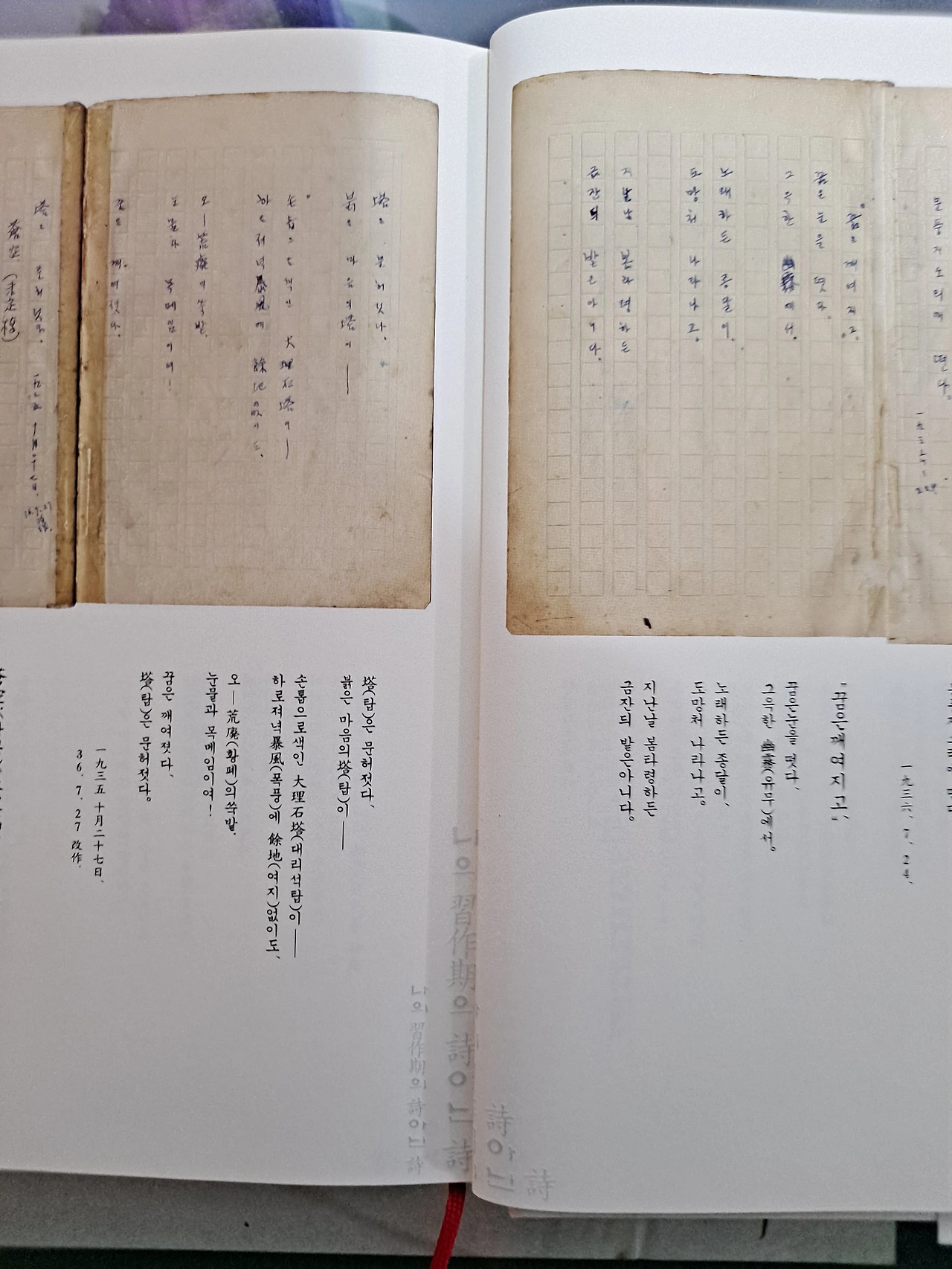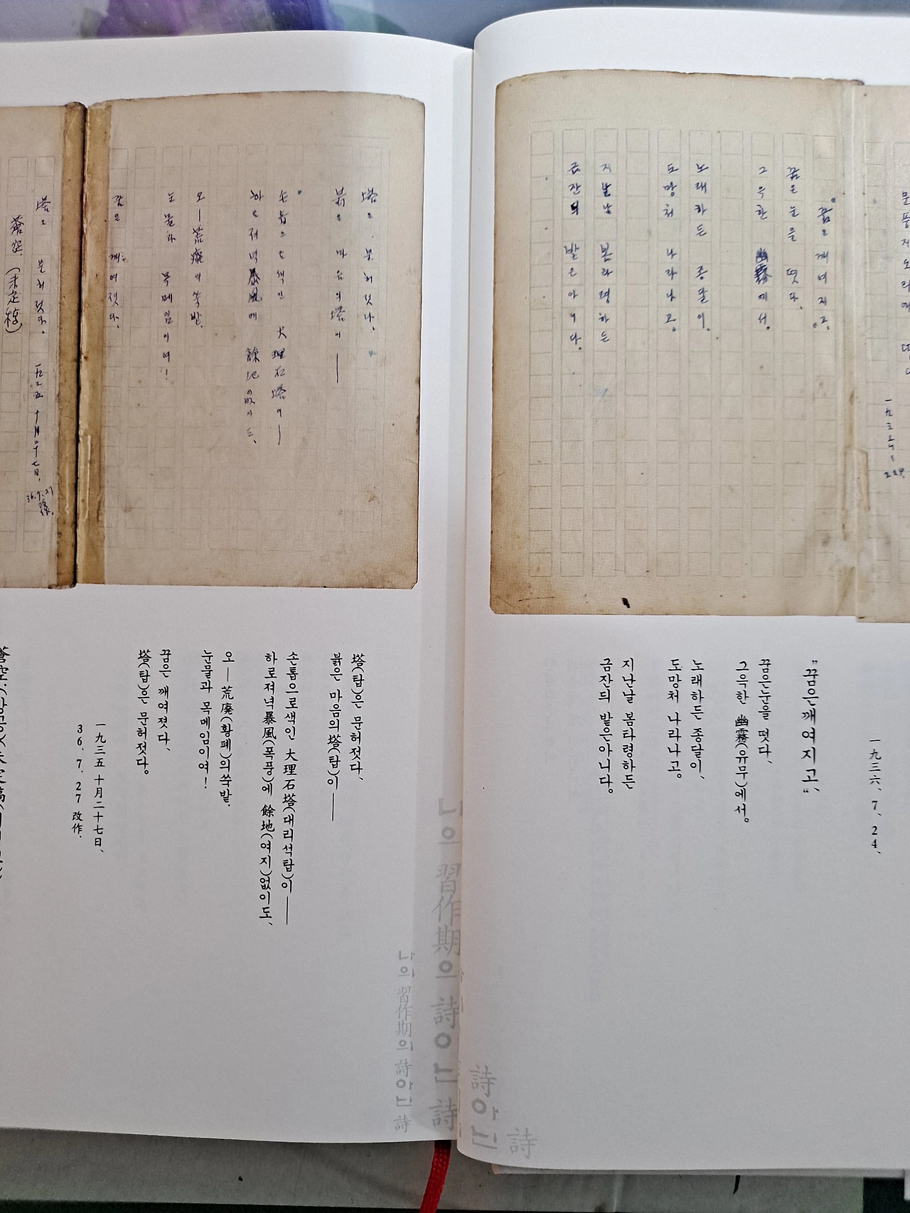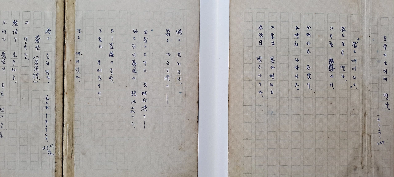 1935년 10월 27일에 탈고한 것으로 되어있다. 그래서, 『나의 습작기(習作期)의 시(詩) 아닌 시(詩)』 에는 개작한 날을 기준으로 해서 상당히 뒷부분에 실려 있는데 나는 탈고한 날을 기준으로 해서 앞부분에 싣고 먼저 다루기로 한다. 앞에 소개한 <공상>의 연장선에 있는 듯하다. <공상>에 등장하는 탑 이야기가 여기서 이어지기 때문에 <공상> 다음에 이어서 하는 것이 더 좋겠다는 생각이 들어서 순서를 바꾼 것이다. 1936년 7월 27일 작품으로 되어 있으나 앞에서 언급했듯이 약 9개월 후에 개작한 작품이다. 화자가 현실에서 느낀 안타까운 감정이 영탄법을 사용함으로써 고스란히 전달되는 시다. 일제의 침략으로 황폐화된 조선의 모습과 이상을 잃어버린 화자의 고백을 통해 뼈아픈 민족적 상실감을 절절히 느낄 수 있다.