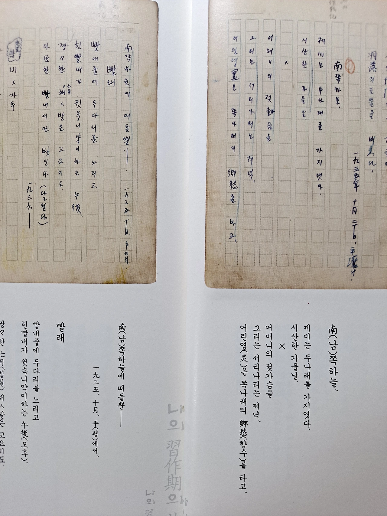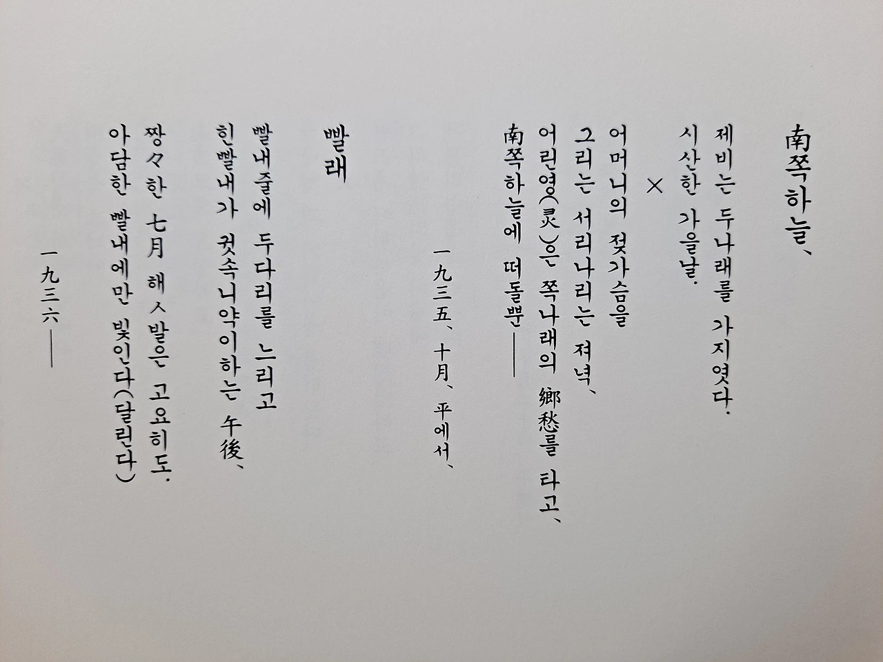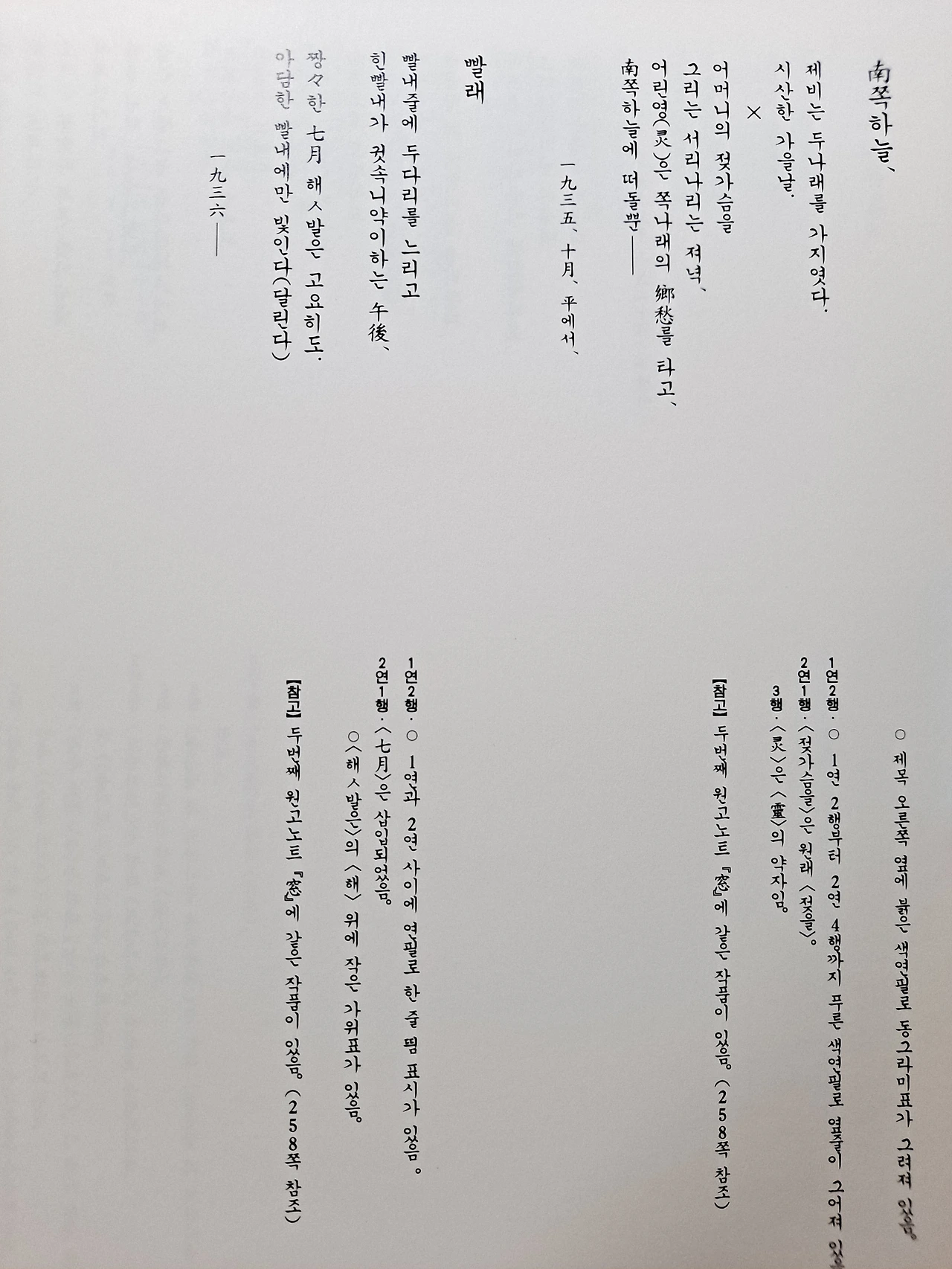 * 어떤 사람들은 남쪽 하늘을 3연으로 읽는 경우가 많다. 하지만 초고에는 분명히 2연으로 되어 있다. 그리하여 나는 2연으로 읽는다.