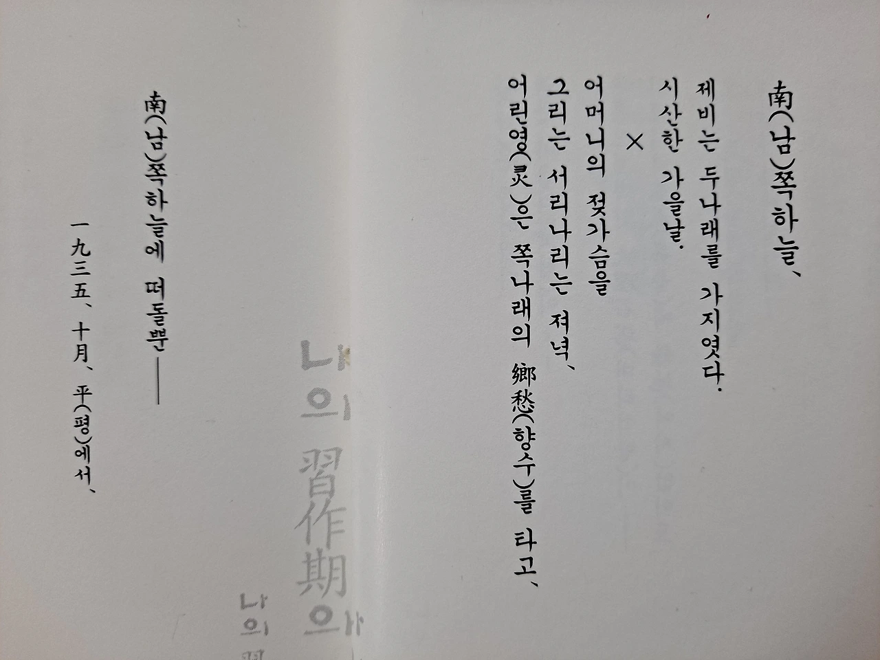 1935년 10월 평양에서 쓴 작품으로 시의 제목인 '남쪽 하늘'은 윤동주 시인이 태어나고 자란 곳이 한반도가 아닌 만주라는 사실을 생각해 볼 때, 시인은 본국인 조선을 그리워하는 조선인으로서 향수를 머금고 남쪽 하늘을 향하여 날개를 펴는 제비를 통해 자신의 정체성을 표출한 것으로 보인다.