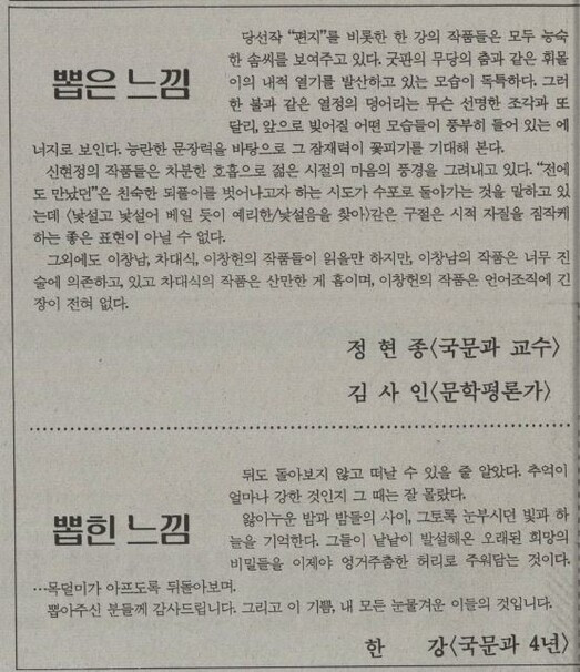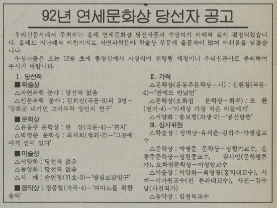 소설가 한강은 1992년 연세대학교 학보사인 연세춘추가 주최하는 ‘연세문화상’에서 윤동주문학상을 수상했다. 자료 1992년 11월 23일 연세춘추 갈무리