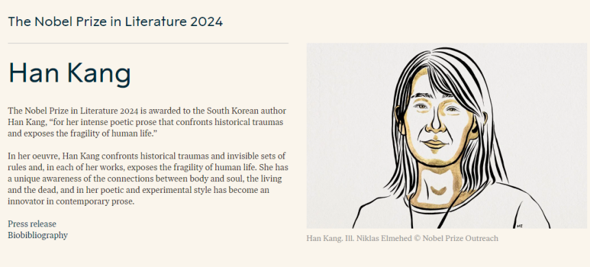 소설가 한강이 한국 작가 최초로 노벨 문학상 수상의 영예를 가져갔다. 사진=노벨상 홈페이지
