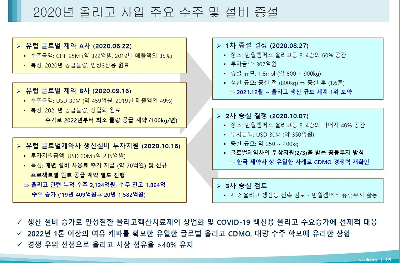 2020년 올리고 사업 주요 수주 및 설비 증설