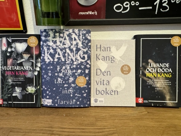 스웨덴어로 번역된 한강 소설들. 왼쪽부터 ‘채식주의자’,‘ 작별하지 않는다’, ‘흰’, ‘소년이 온다 ’. 오경진 기자