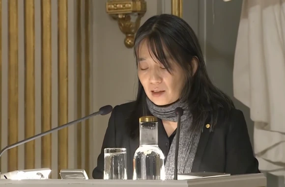 7일(현지시간) 스웨덴 스톡홀름 한림원에서 노벨상 수상 연설문을 낭독하고 있는 소설가 한강. 노벨위원회 제공