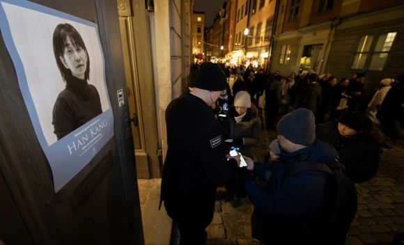 7일(현지시간) 2024 노벨문학상 수상자인 한강 작가의 강연이 열리는 스웨덴 스톡홀름 한림원에서 강연에 참석하는 교민 및 현지인들이 보안요원에게 입장을 위해 QR코드를 제시하고 있다. 연합뉴스
