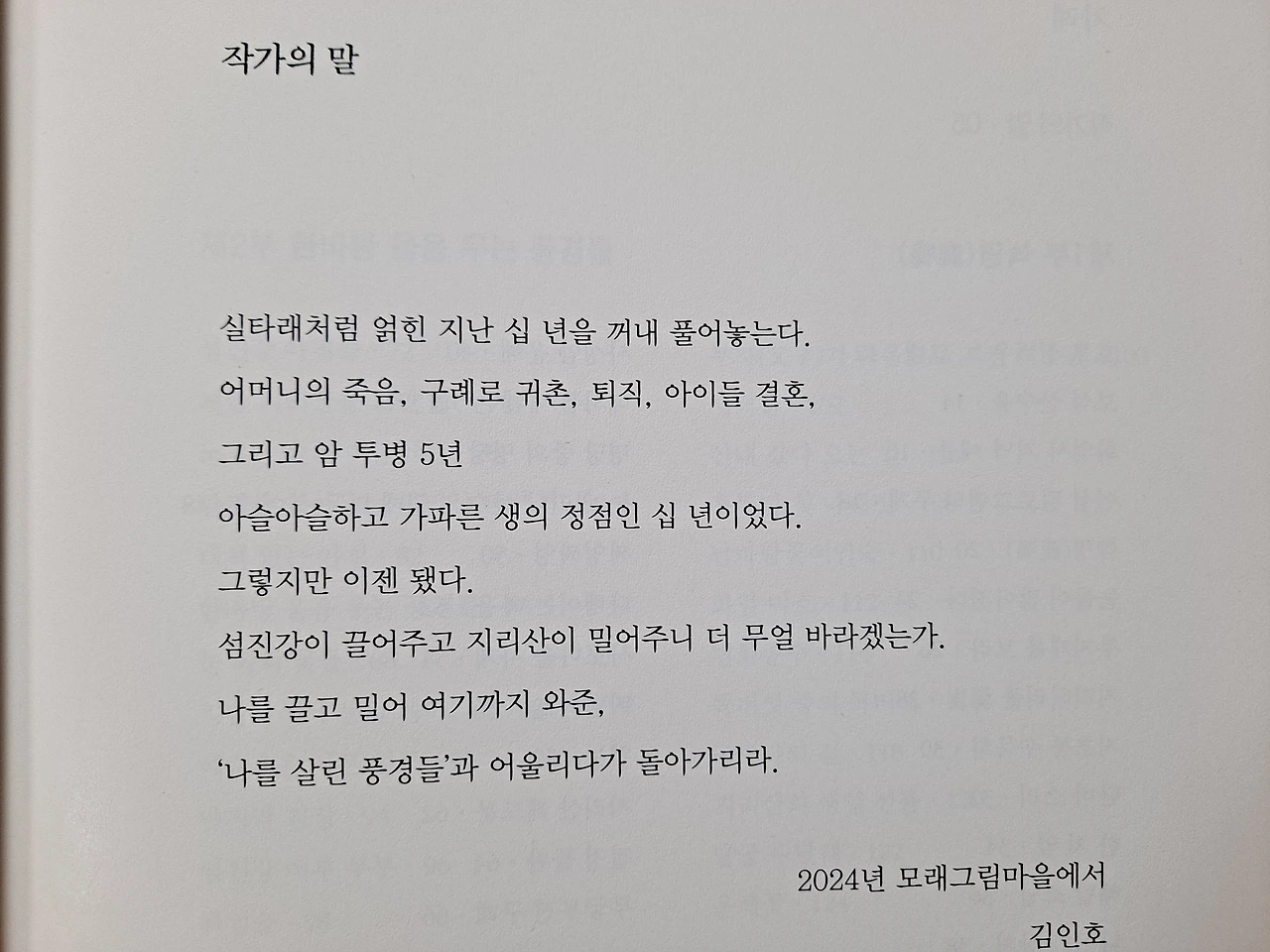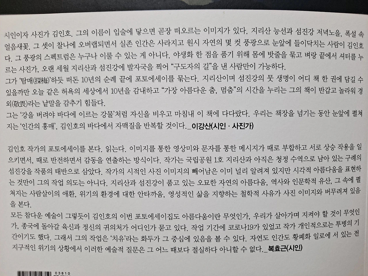 김인호 시인의 출발은 편지였다. 『땅끝에서 온 편지』『섬진강 편지』『꽃앞에 무릎을 꿇다』『지리산에서 섬진강을 보다』『나는 구례다』『구례의 들꽃』『나를 살린 풍경들』……, 나는 영광스럽게도 김인호 시인의 첫 시집의 해설을 썼다. (앞으로 언젠가는 김인호 시인의 꿈과 삶과 글에 대한 긴 글을 써볼 작정이다. 특히 이번에 받은『나를 살린 풍경들』은 천천히 조금씩 조금씩 곱씹어야 더욱 의미가 있을 것이다. 이번 책의 키워드는 녹명과 호모 심비우스 그리고 데미샘과 사성암이 될 것 같다.)