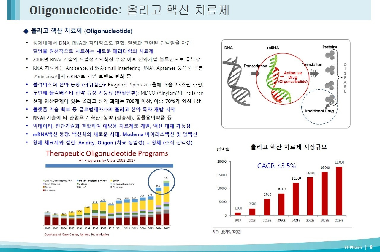 현재 에스티팜이 생산하는 이 물질은 원료부족으로 인해서 많은 문제를 겪고 있다고 한다. 에스피탐의 보고서를 살펴보면 올리고뉴클레오타이드 위탁개발시장에서 아시아에서는 1위 자리를 지키고 있고 세계로 넓혀 봐도 3위권으로 상당한 위치에 있다고 한다. 이렇게 먼저 자리를 잡고 있는 기업이기에 견고한 모습을 보이고 있다.