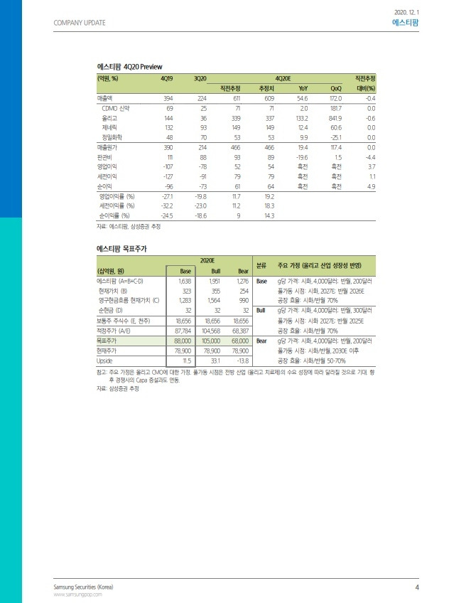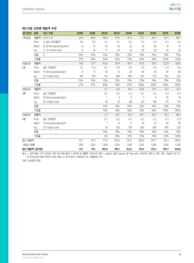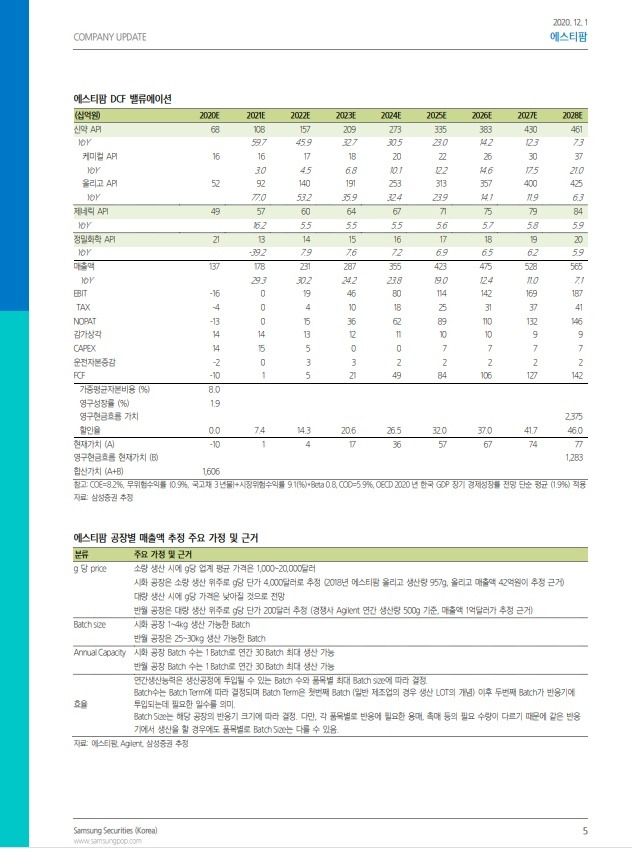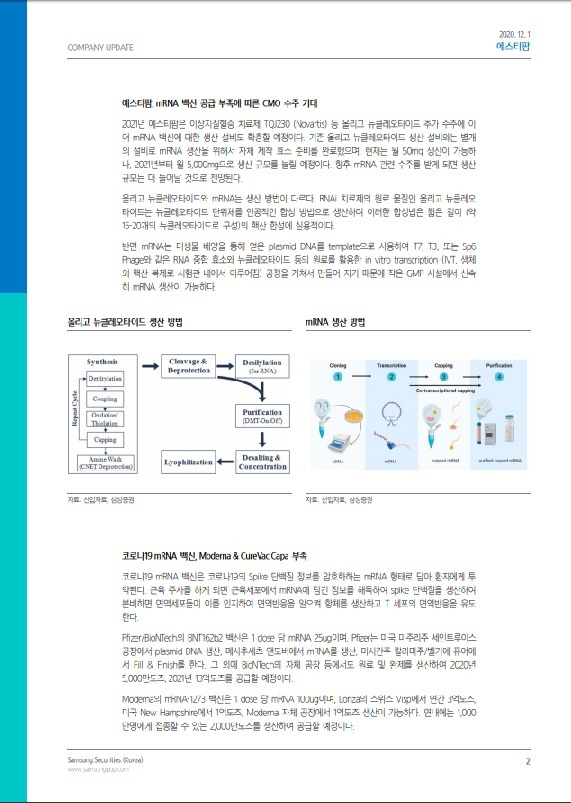 ◆"생산량 100배 증량“ 손님맞이 채비 갖춘 에스티팜= 에스티팜은 본격적 사업 외연 확장을 위해 mRNA 생산량을 크게 늘릴 계획이다. 이로써 ‘손님맞이’를 할 만반의 채비를 갖췄다. 서근희 삼성증권 연구원은 “에스티팜은 mRNA 생산량을 현재 월 2000도즈 생산에서 2021년 월 20만도즈로 늘릴 예정”이라고 밝혔다. 서 연구원은 또 “(에스티팜은) 화이자, 모더나, 큐어백 등으로부터 수주 시점에 생산량을 추가로 확장 예정”이라고 덧붙였다.