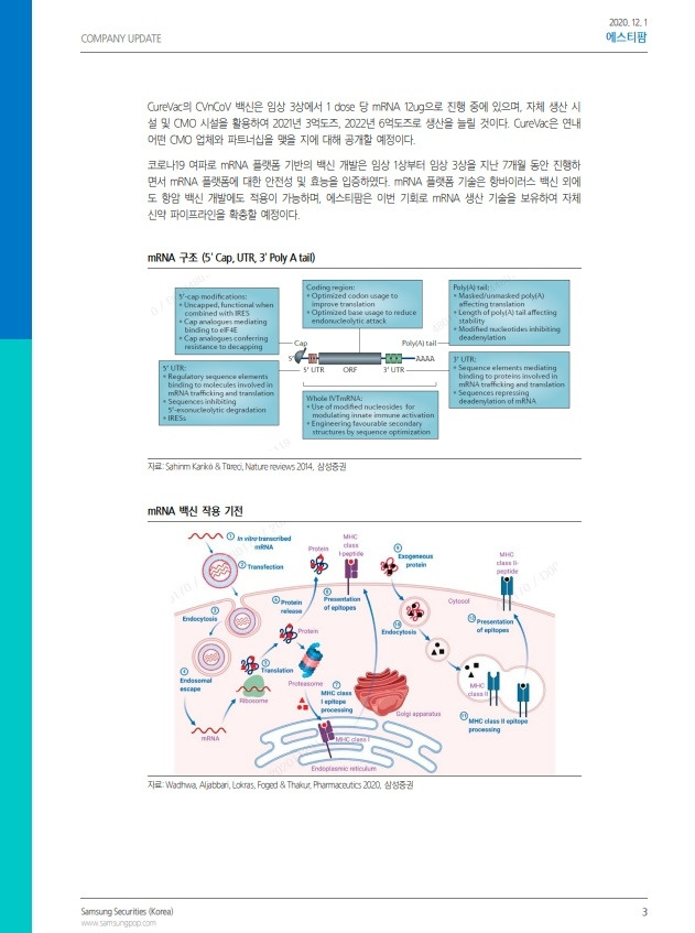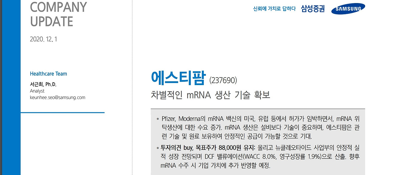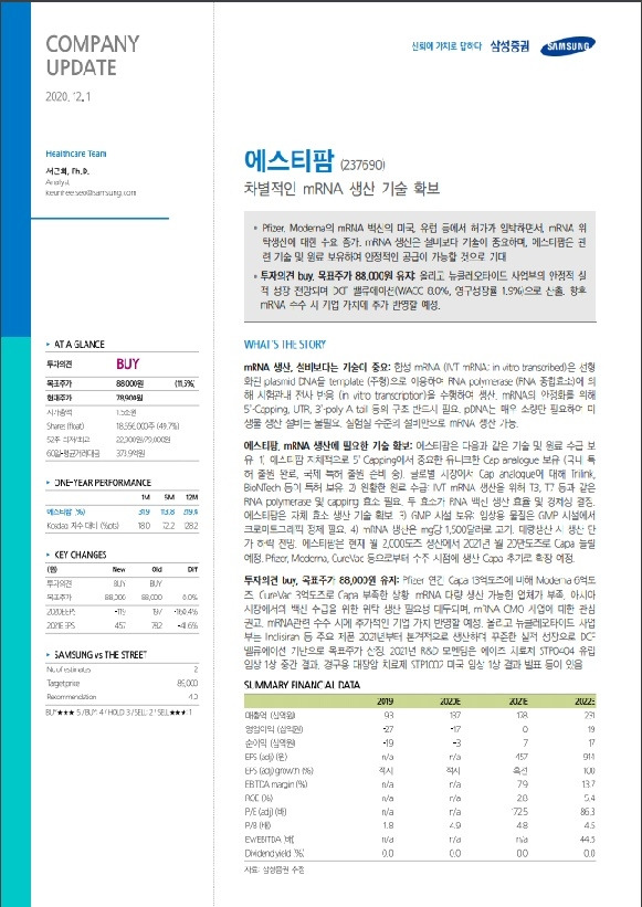 특히 주요 글로벌 제약사들이 개발중인 mRNA기반 코로나19 백신이 기대를 모으는 점도 에스티팜의 이번 mRNA 치료제 및 백신 사업 진출에 영향을 미쳤다. 미국의 화이자와 모더나가 mRNA기반 코로나19 백신 개발을 하는 대표적인 기업들이다.