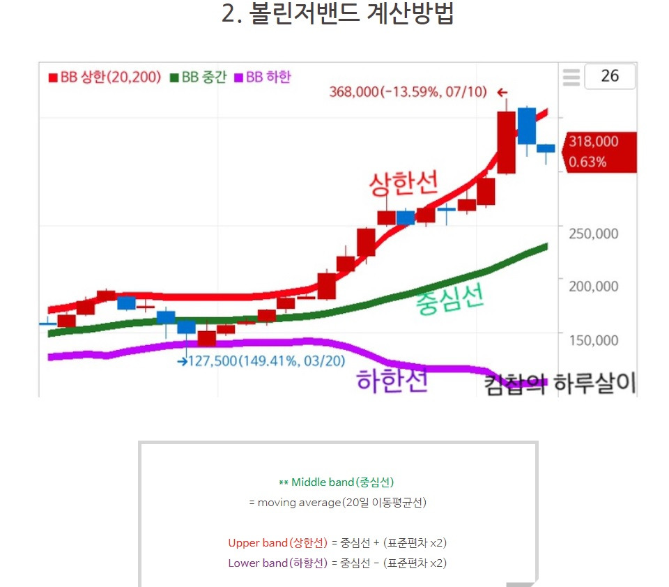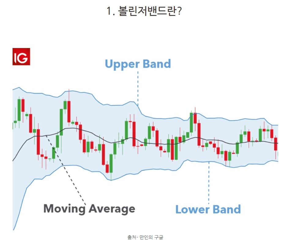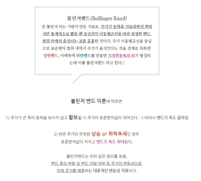 존 볼린저 라는 사람이 만든 지표로, 주가가 등락을 거듭하면서 변하지만 통계적으로 봤을 땐 중심선인 이동평균선을 따라 일정한 밴드 범위 안에서 움직이는 것을 응용한 것이다. 주가 이동평균선을 중심으로 표준편차 범위 내에서 주가가 움직인다는 것을 전제로 위쪽엔 상한밴드, 아래쪽에 하한밴드를 만들면 가격변동폭의 띠가 형성되는데 이를 볼린저밴드 라고 한다.!