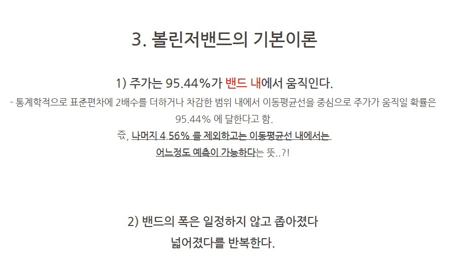 - 통계학적으로 표준편차에 2배수를 더하거나 차감한 범위 내에서 이동평균선을 중심으로 주가가 움직일 확률은 95.44% 에 달한다고 함.
