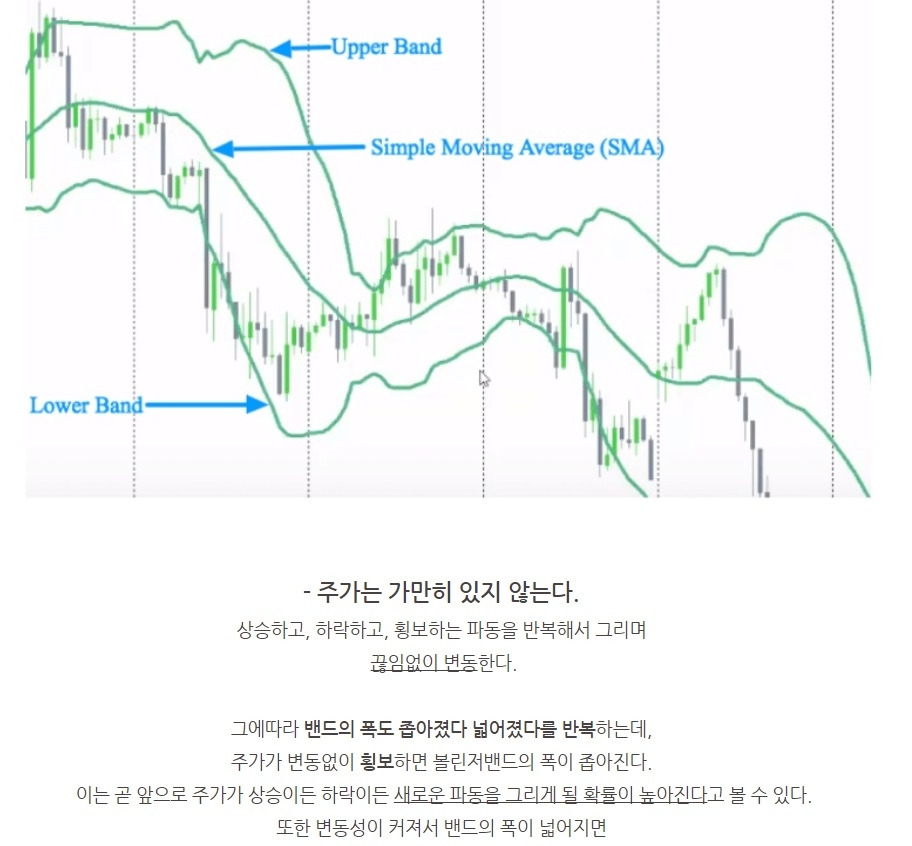 주가가 변동없이 횡보하면 볼린저밴드의 폭이 좁아진다.