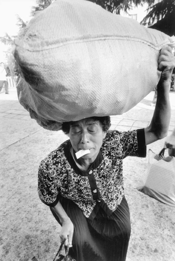 이 모든 물건들을 아주 큰 보자기에 싸서 이고 가는 여인이 있었다. 집을 나설 때에는 빈 헝겊 자루들이 똬리 역할을 했지만, 그 접혀 있었던 자루들이 불룩하게 다 채워지고 네모난 박스 위에도 묘지처럼 볼록해서 보름달이 되어야만 집으로 돌아가는 여인이었다.