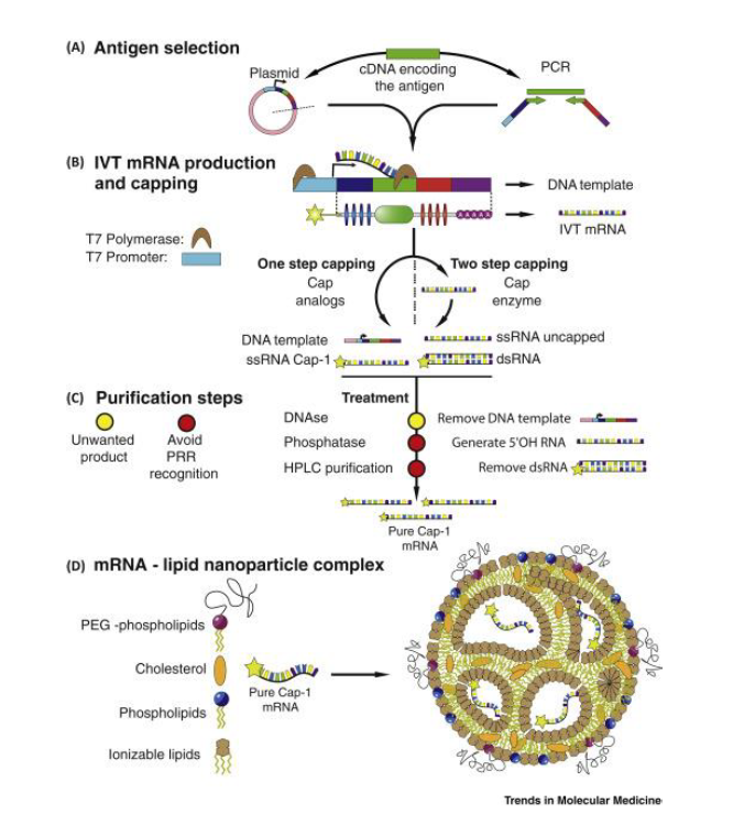 RNA 백신을 생산하기 위해서는 ▷항원 선정(antigen selection) ▷mRNA생산과 캡핑(IVT mRNA production and capping) ▷정제 과정(Purification steps) ▷전달을 위한 LNP 등 공정(Lipid Nanoparticle Complex) 과정을 거쳐야 합니다.