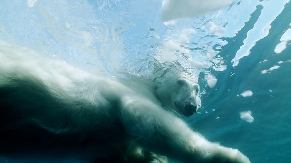 북극해에서 장시간 헤엄치는 북극곰을 포착한 수중 촬영 영상을 통해 북극곰이 생존을 위해 더 오랜 시간 수영해야 하는 현실을 생생하게 전달했다.