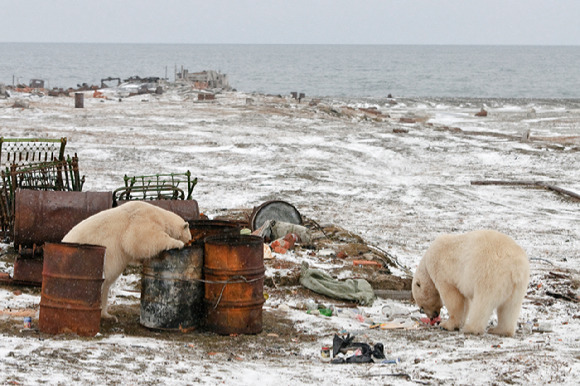 WWF는 도심으로 내려온 북극곰이 먹이를 찾고 있는 모습을 담은 사진을 공개했다. 러시아 토볼스키(Tobolski) 유전 지역에서 촬영된 사진에는 북극곰이 사냥감을 찾지 못한 채 사람들의 거주지 주변을 배회하는 모습이 담겼다.