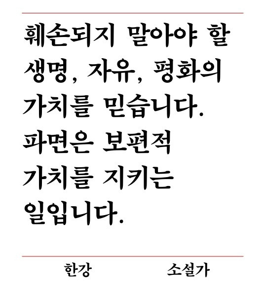 한강 작가는 ‘피소추인 윤석열의 파면을 촉구하는 작가 한 줄 성명’이라는 이름으로 배포된 성명을 통해 “훼손되지 말아야 할 생명, 자유, 평화의 가치를 믿는다. 파면은 보편적 가치를 지키는 일”이라고 밝혔다.