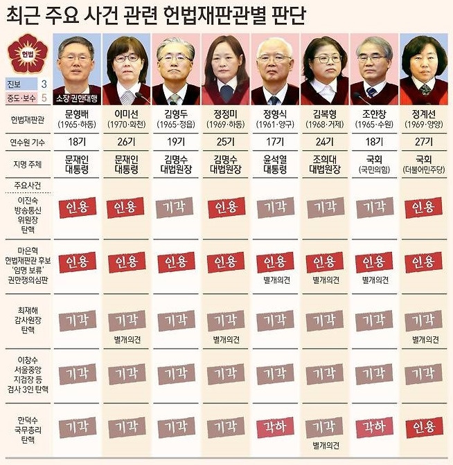 거기에는 어떠한 분들이 앉아 계실까요? 최근에 8분의 재판관이 내린 결정을 분석해보면 그 속마음이 읽힙니다. 가장 진보적인 분은 정계선 재판관님(이하 존칭 생략함)이고, 다소 진보적인 분은 문형배, 이미선 그리고 정정미 3분입니다. 큰틀에서 보아, 이상의 4분은 12.3내란 사태에 관해서도 시민의 편에 설 것으로 보입니다.