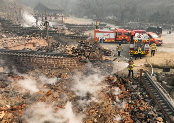 중수 작업하는 소방대원들 - 26일 경북 의성군 단촌면 고운사에서 소방대원들이 불에 탄 건물 위에 물을 뿌리고 있다. 2025.3.26 연합뉴스