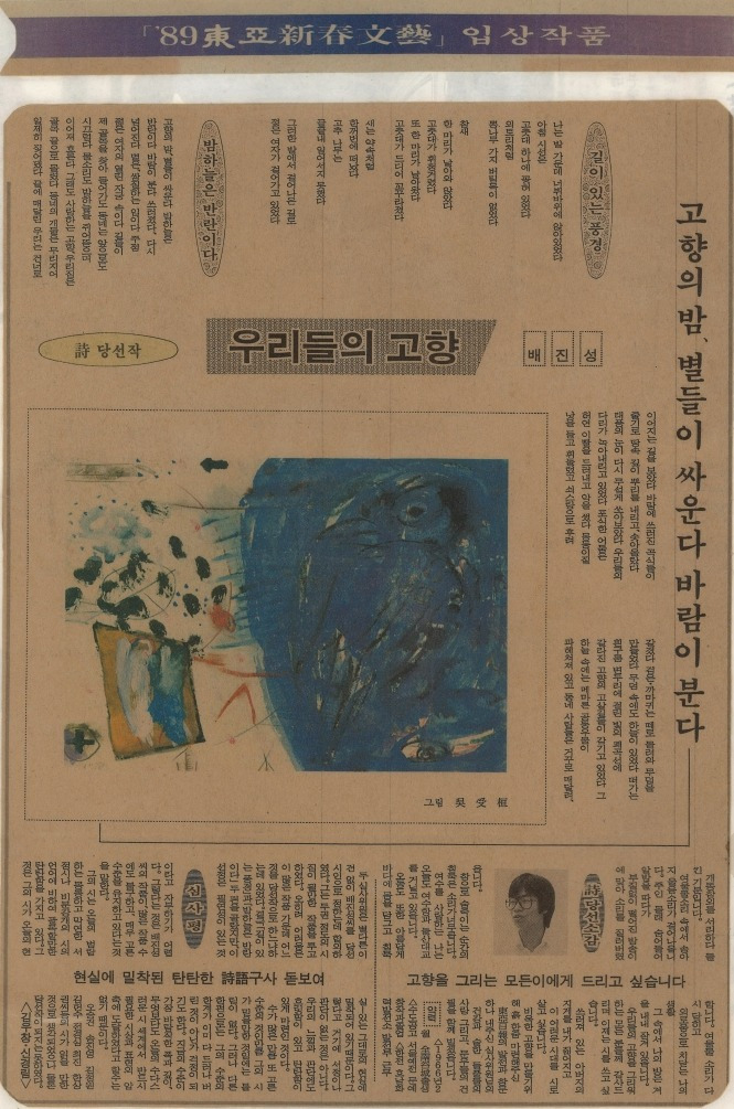 고향 마을의 바위 하나, 나무 하나도 그에겐 소중한 존재였다. ‘허락 바위’가 관공서 치장석으로 끌려갔다 ‘自律(자율)’이란 한자를 몸에 새긴 채 고향 강변의 제자리로 돌아올 수 있었던 것도 그의 노력이 컸다. 죽어가던 정자나무를 살리고, 떠내려간 강가 징검다리를 어느해 추석, 동네 사람들과 울력으로 놓았다. 마을 공동체를 일구는 마을 사람들에 대한 헌사도 가득하다.