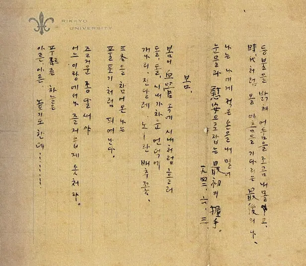 그러나 윤동주의 일본 유학 생활은 그리 행복하지 않았던 것 같다. 기독교계 학교인 릿쿄대학에도 군국주의 조류가 밀려들어 1942년 첫 학기부터 전시 체제에 맞추어 군사 훈련이 시작되었고 머리를 삭발하는 제도가 시행됐다. 그리고 1943년에는 문학부가 강제로 폐쇄되는 탄압을 받게 된다. 윤동주가 교토 도시샤대학으로 전학한 데에는 이런 이유도 있었을 것이다. 이런 상황에서도 그는 봄의 정취를 전신으로 흡수하려는 자세를 취했다. 시대는 고통스럽지만 봄의 아름다움을 그대로 받아들여 마음의 지향으로 삼고자 했다.