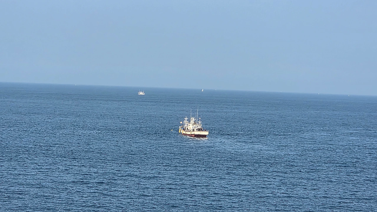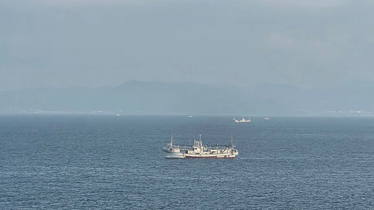 곁에서 고기를 잡는 작은 배가 흔들린다