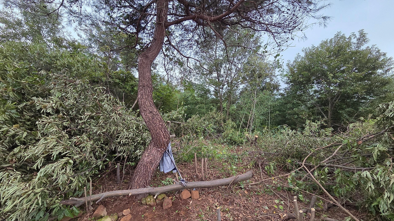 소나무 곁에 원두막을 만들려고 나무를 자른다