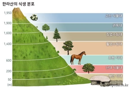 한라산 중복(中腹)의 온대림은 한반도에서와 같이 서나무·졸참나무·단풍나무·산벚나무 등으로 구성된다. 그 윗부분에는 물참나무의 순림(純林)이 발달하였으며, 더 높은 곳의 한대림은 구상나무·고채목 등이 대표적인 종이다. 정상부에는 떡버들·털진달래·눈향나무·시로미·설앵초·담매·들꽃나무 등이 자란다.