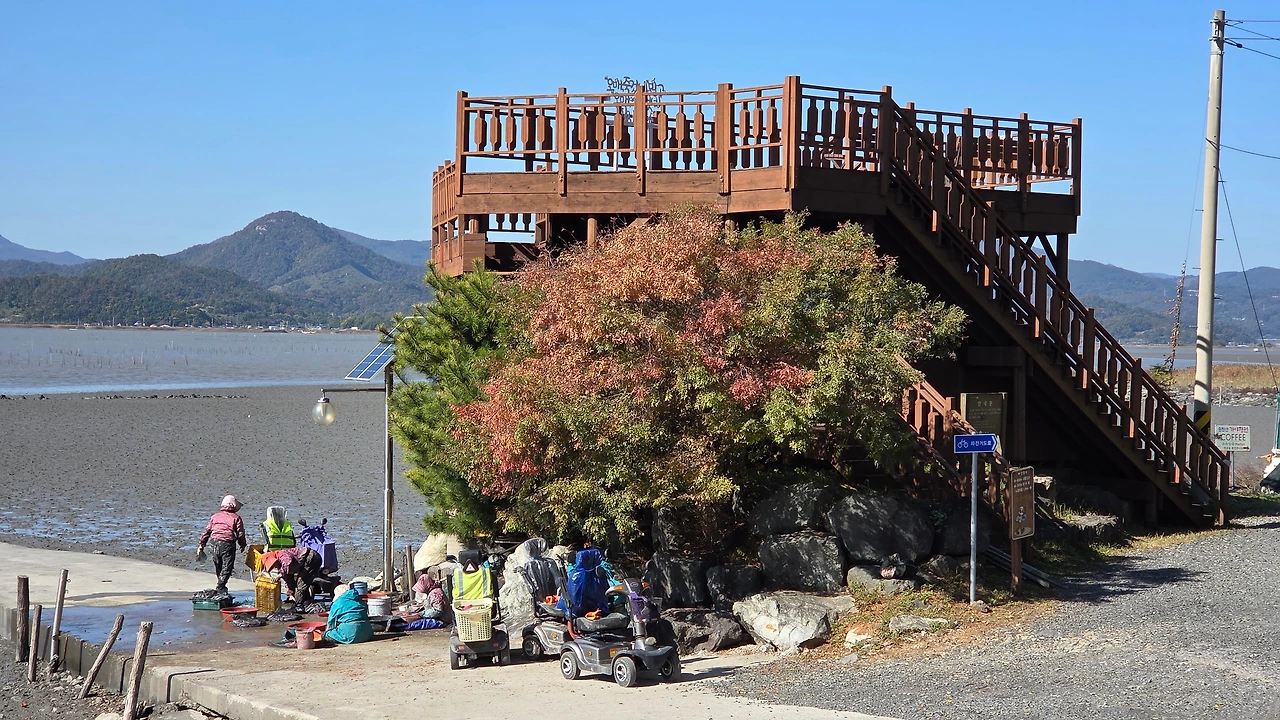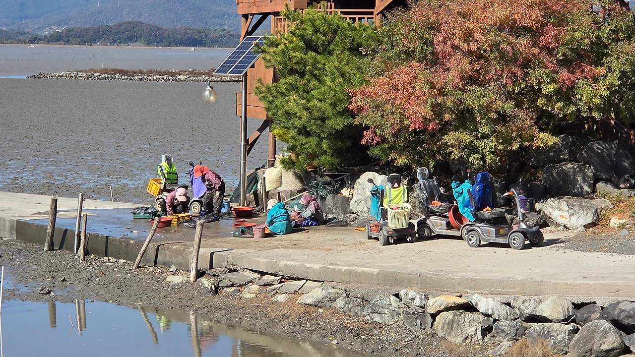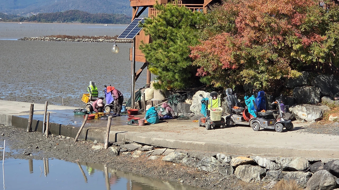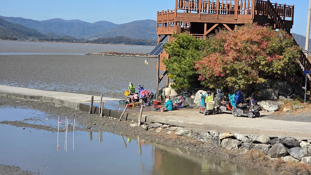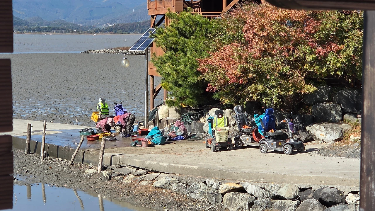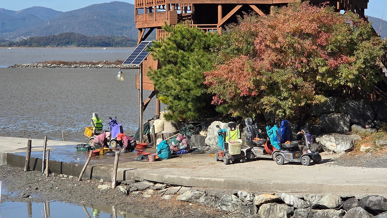 전동차를 타고 나와 바닷일을 하는 할머니 네 분들은