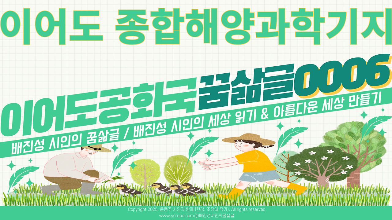 장자(莊子)가 물 위에 앉아있다 생각하는 로댕이 바다에 앉아있다 장자의 곤(鯤)이 보였다가 장자의 대붕(大鵬)이 보인다 대붕이 날아가다 쉬고 있다 한쪽 날개를 펼치고 숨을 가다듬고 있다 로댕의 생각하는 사람이 앉아있다 지옥문 앞에서 꼼짝 하지도 않고 깊이 생각을 하고 있다 다시 보니 새가 한 마리 쉬고 있다 나비가 한 마리 쉬고 있다 나비의 꿈이 쉬고 있다 꽃 한 송이 피어나고 있다 윤동주 시인은 생각하는 사람이라고 말한다 배진성 시인은 꽃 한 송이 피어나서 나비가 앉아 있다고 말한다 자세히 보니 헬기 착륙장이 바다에 떠 있다 태양광 패널들이 반짝이고 있다 더 깊이 생각하니 태평양에 연꽃 한 송이 피어 있다 평화의 연꽃 한 송이 꽃피어 있다 설문대할망의 막내아들 지극정성으로 연꽃이 다시 피어나고 있다 남극노인성의 숨결과 꽃감관의 손길로 어머니가 부활하여 서서히 꽃으로 피어나고 있다 구름 가득한 하늘에 다시 향기롭게 젖을 물린다 남서쪽에서 불어오는 바람의 숨결이 새처럼, 나비의 꿈처럼, 격렬비열도(格列飛列島)와 독도(獨島) 사이로 조용히 흐른다 하늘에는 은하수가 흐르고 땅과 바다에는 윤슬처럼 미리내가 흐른다 내 이름은 이어도, 하지만 사람들은 아직도 나를 배진성으로 기억하는 사람들이 있다 성인해로 기억하는 사람들도 있다 강산으로 기억하는 사람들도 있다 성진으로 기억하는 사람들도 있다 하지만 분명히 말하지만 나의 이름은 이어도, 나는 이어도공화국이다