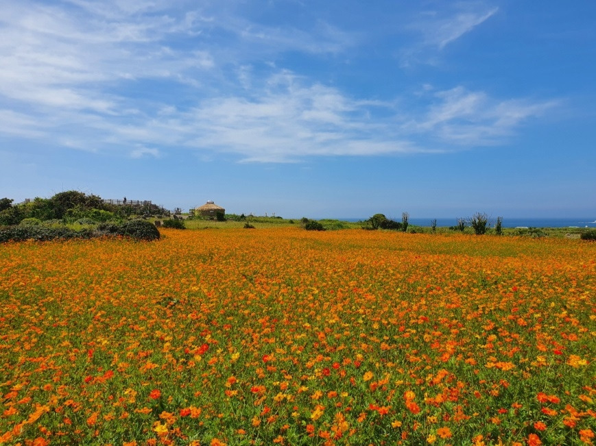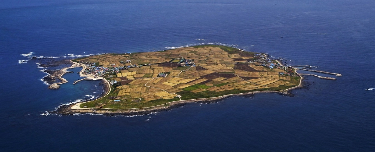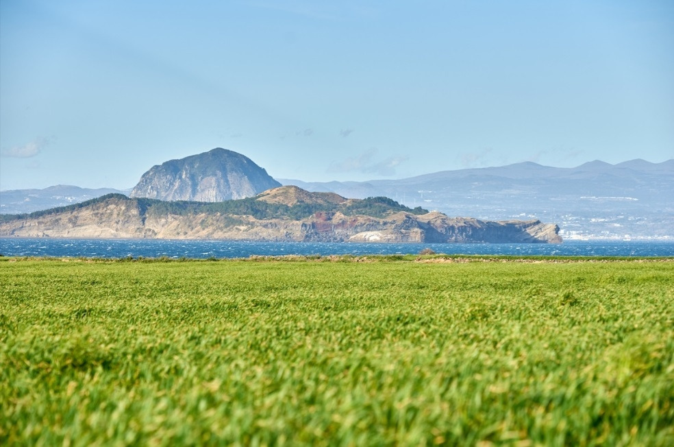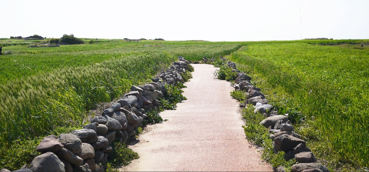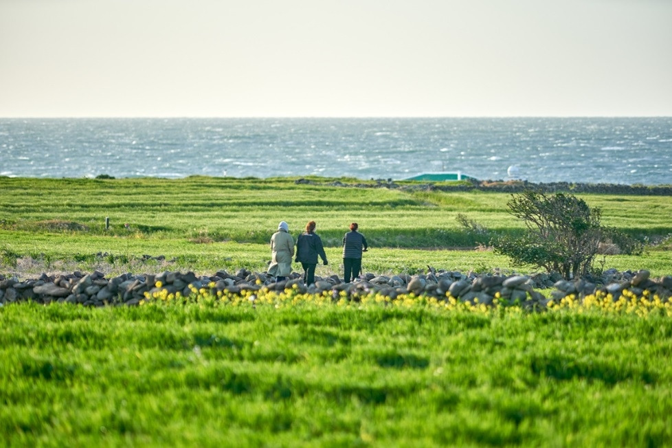 한국에 있는 섬 중에서 가장 낮게 자리한 섬, 탁자처럼 펼쳐진 평평한 대지를 걸어가 보니 가슴이 시원하다. 구멍을 크게 뚫어 쌓은 밭의 돌담들이 정겹다. 돌과 돌 사이의 구멍을 촘촘하게 쌓으면 양지바른 밭이 되지만, 반대로 태풍이 몰아쳐 오면 무너져버리기 때문에 자연과의 조화를 이루어야 농사를 잘 지을 수 있는 곳이다. 하느적거리는 억새풀들 위로 설치된 바람개비 풍력은 바람이 불지 않아 돌아가기를 잠시 멈추고 기다란 휴식을 취하고 있었다.
