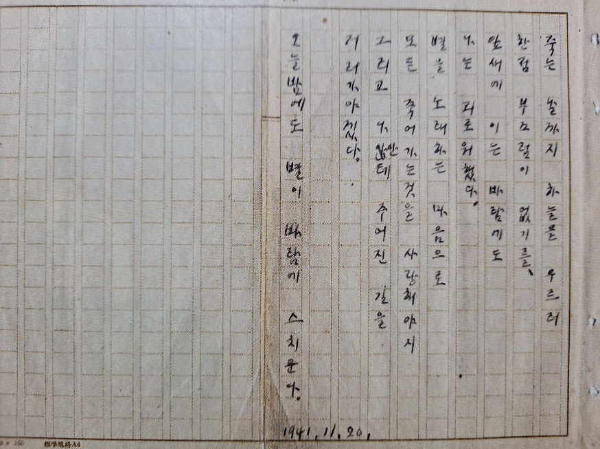 죽는 날까지 하늘을 우러러/한 점 부끄럼이 없기를,/잎새에 이는 바람에도/나는 괴로워했다/별을 노래하는 마음으로/모든 죽어가는 것을 사랑해야지/그리고 나한테 주어진 길을/걸어가야겠다//오늘 밤에도 별이 바람에 스치운다 (1941. 11. 20. 윤동주 24세) ―「서시(序詩)」